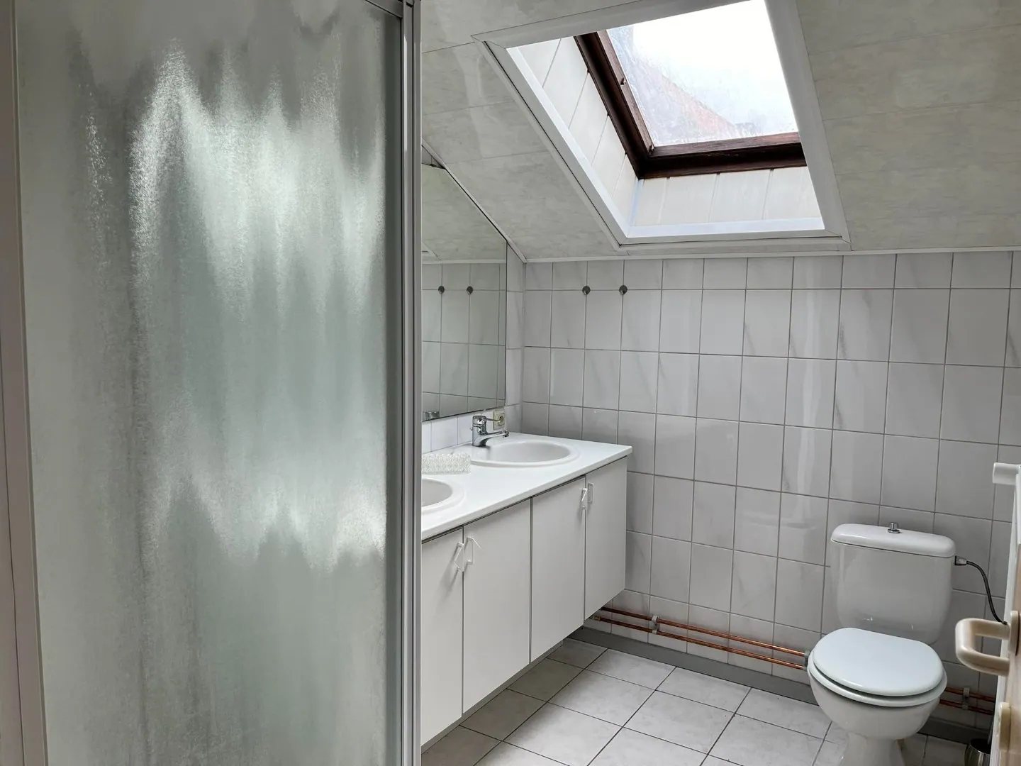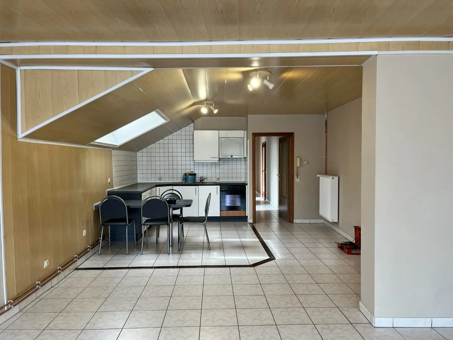 Inkomhal - lichtrijke leefruimte met ingerichte keuken - 2 slaapkamers - berging - badkamer met wastafel, douche en toilet - terras.