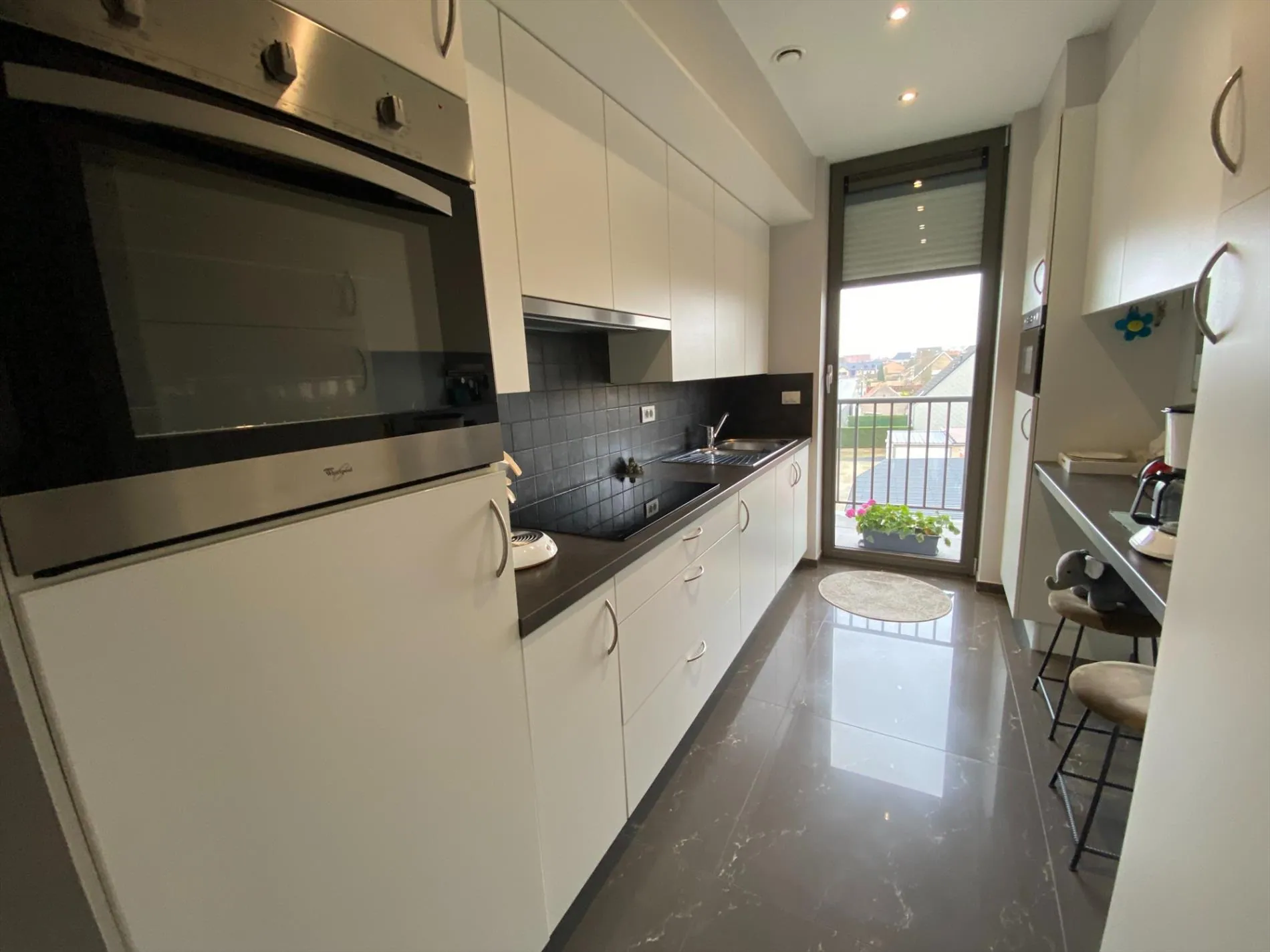 leefruimte met aansluitend terras met zicht op de markt - ingerichte keuken - apart toilet - ruime slaapkamer - badkamer met dubbele wastafel en inloopdouche - berging - zonneterras achteraan