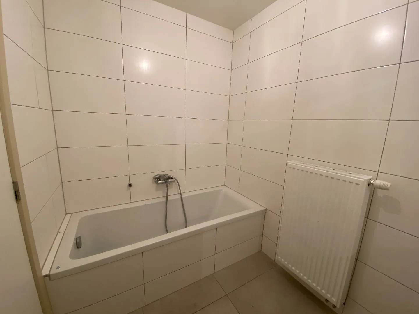 Hal - toilet - badkamer met ligbad en badkamermeubel - 2 slaapkamers - wasberging - leefruimte met open, volledige geïnstalleerde keuken.