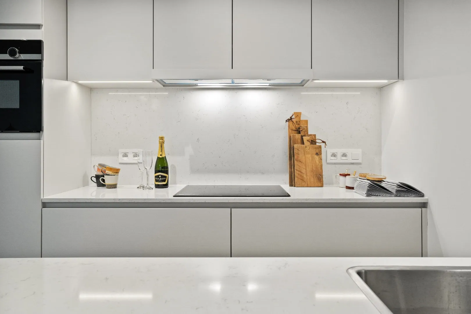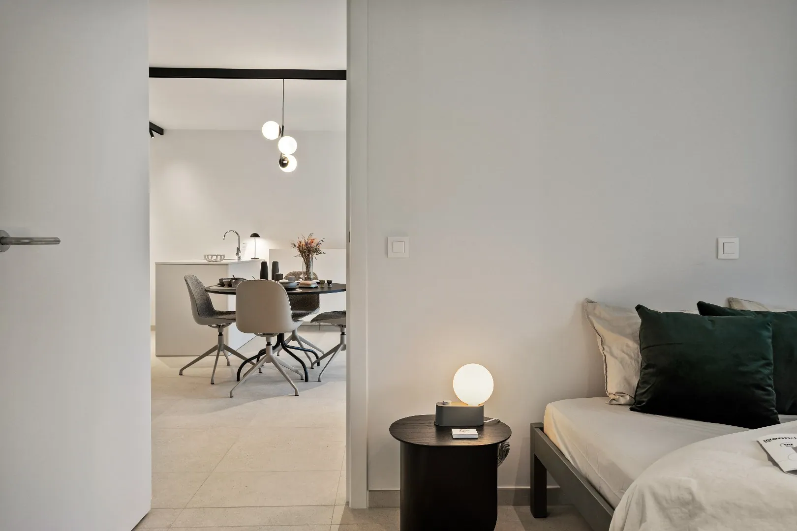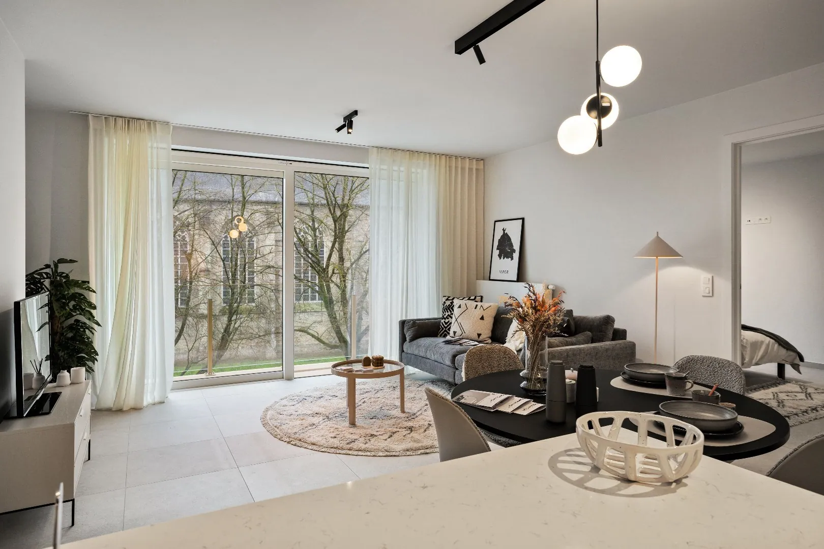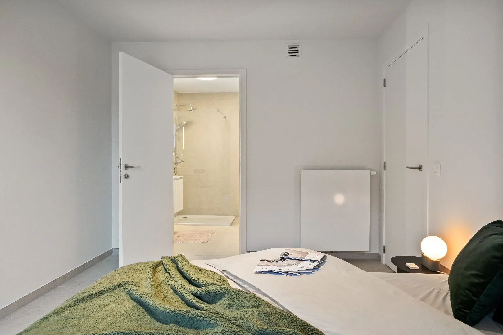 Inkomhal met toilet - leefruimte met open - volledige ingerichte keuken- ruime keukenberging, ruime slaapkamer met aansluitende badkamer en zuidelijk terras.