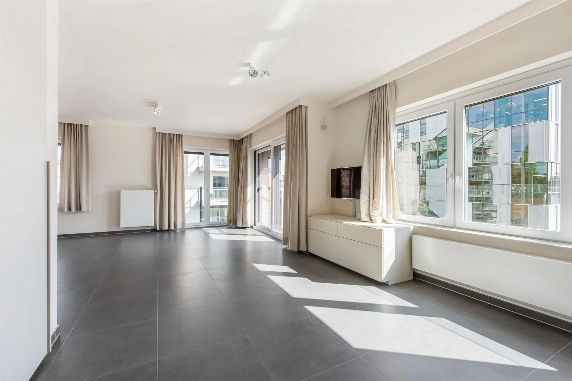 Ramen voorzien van zonnewering, vliegenramen en gordijnen.