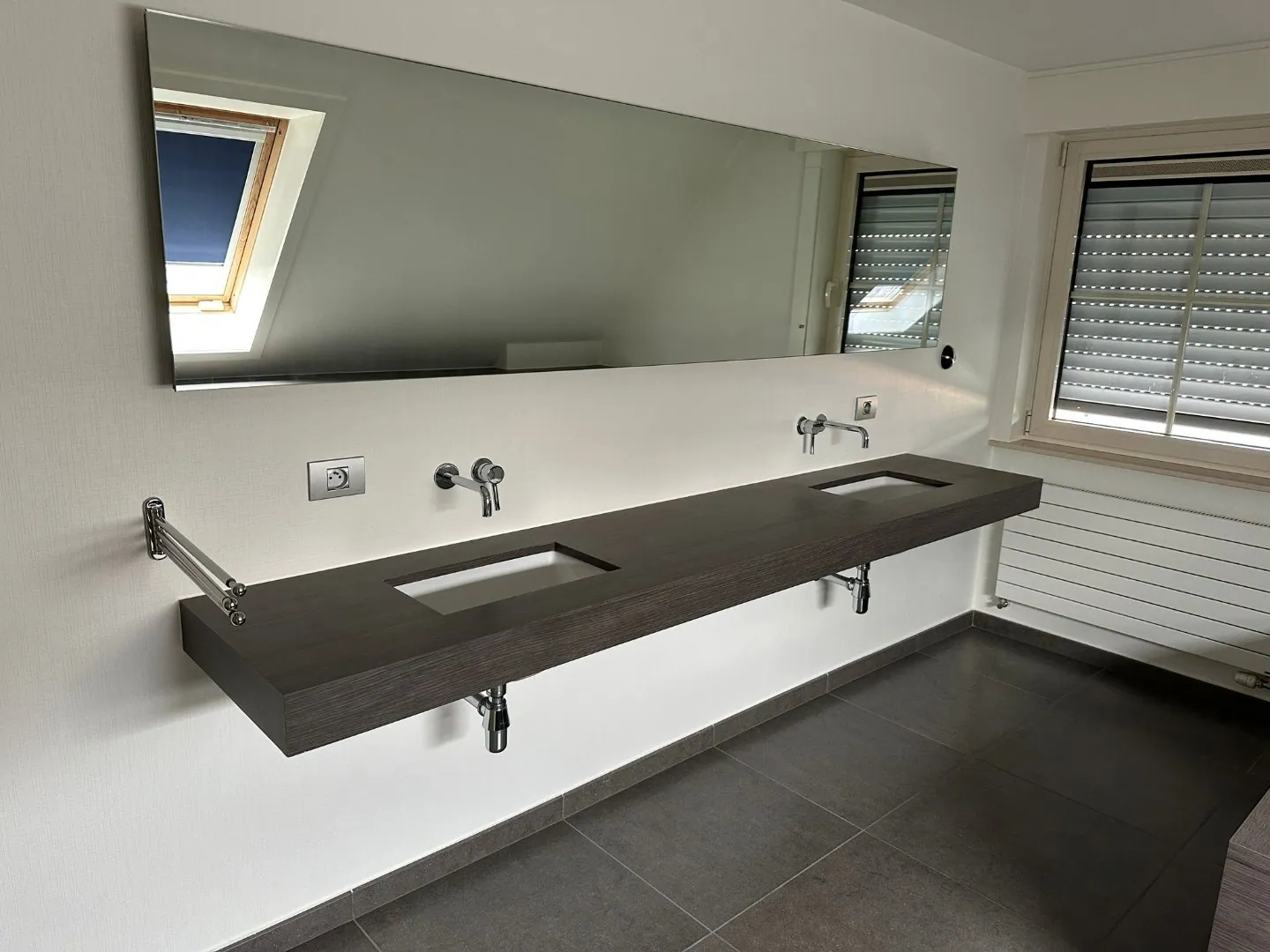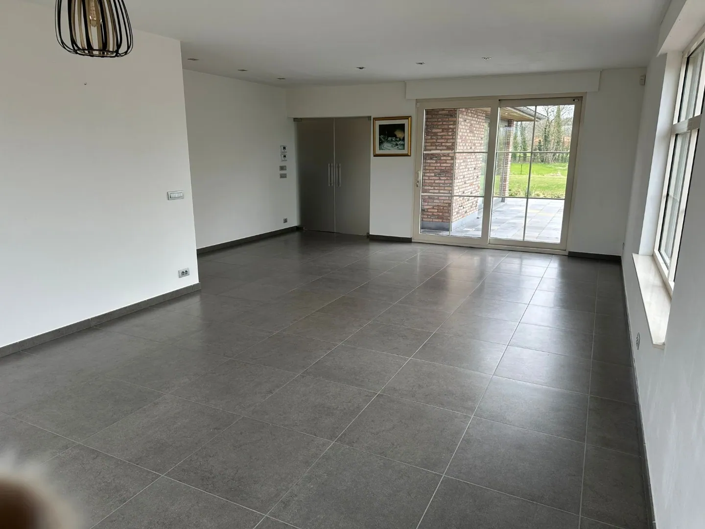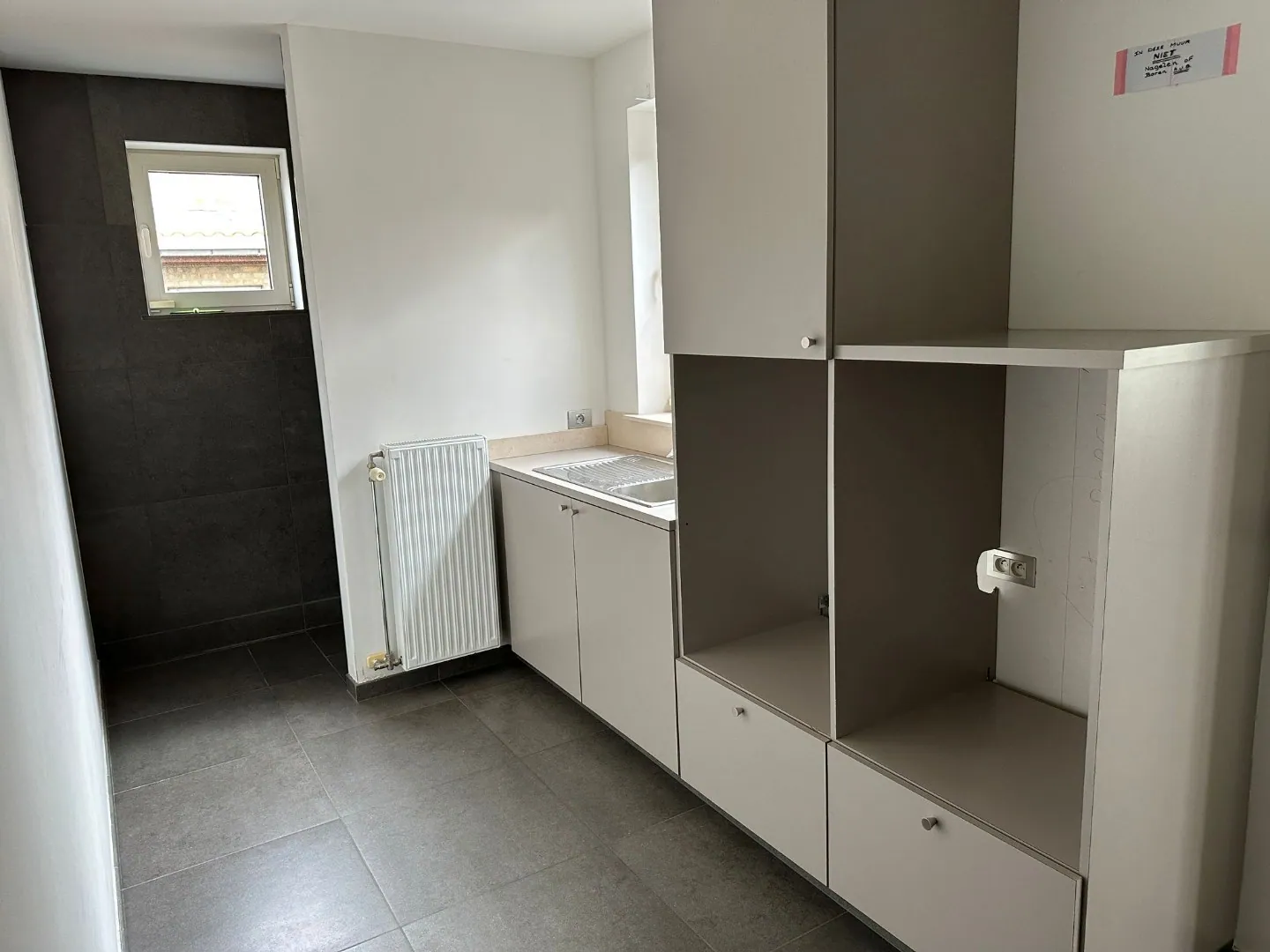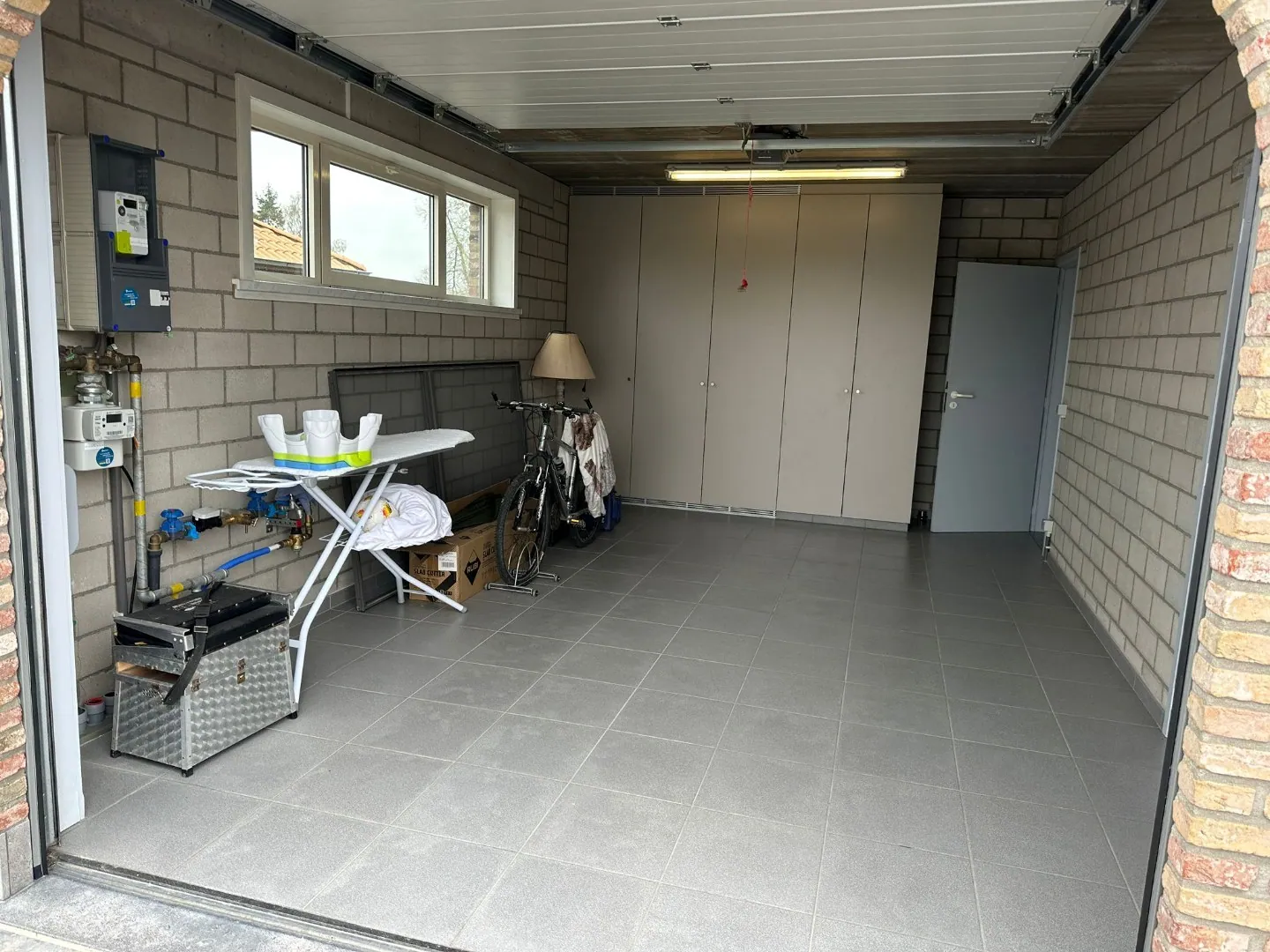 Gelijkvloers: inkom, garage, leefruimte, grote keuken (inductiekookplaats, vaatwas, microgolf, oven, frigo), toilet, aparte ruimte met spoelbak en douche.