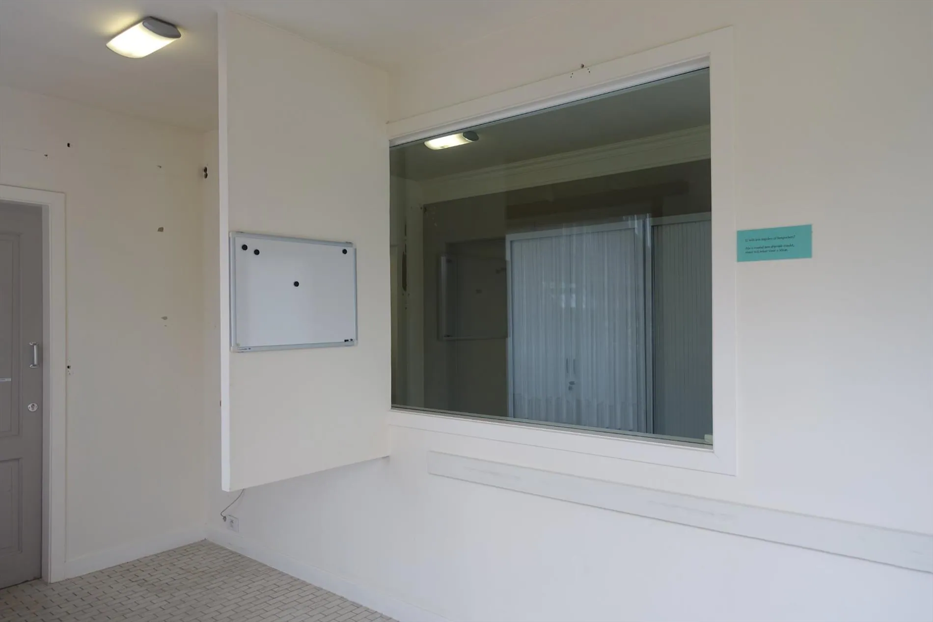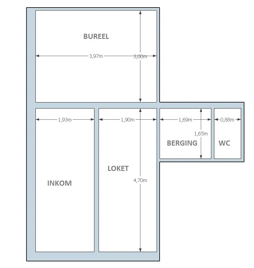 De ruimte bestaat uit: inkomhal - bureau - loket - berging - toilet.