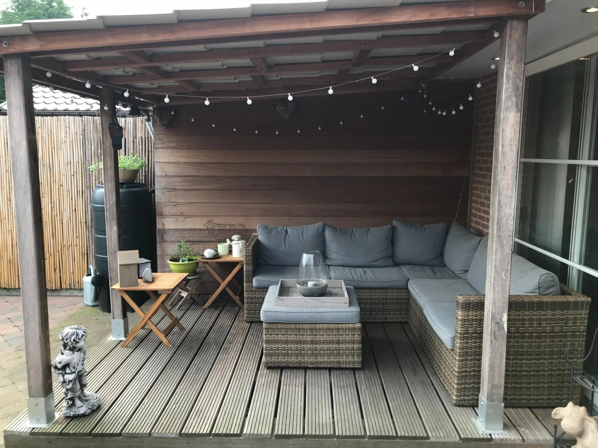 Onderhoudsvriendelijke tuin met tuinhuis en overdekt terras.