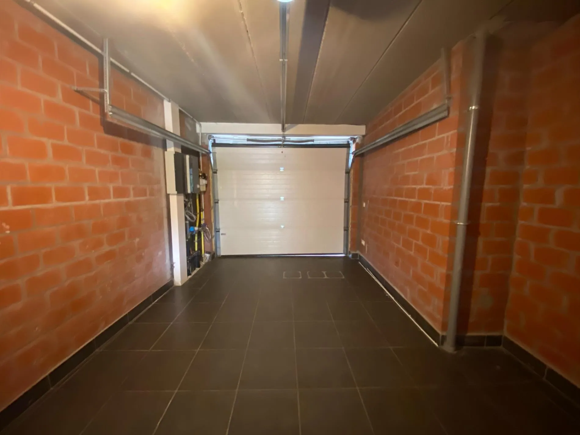 Gelijkvloers: inkomhal - gastentoilet - lichtrijke leefruimte met open, volledig ingerichte keuken - garage met automatische sectionaalpoort.