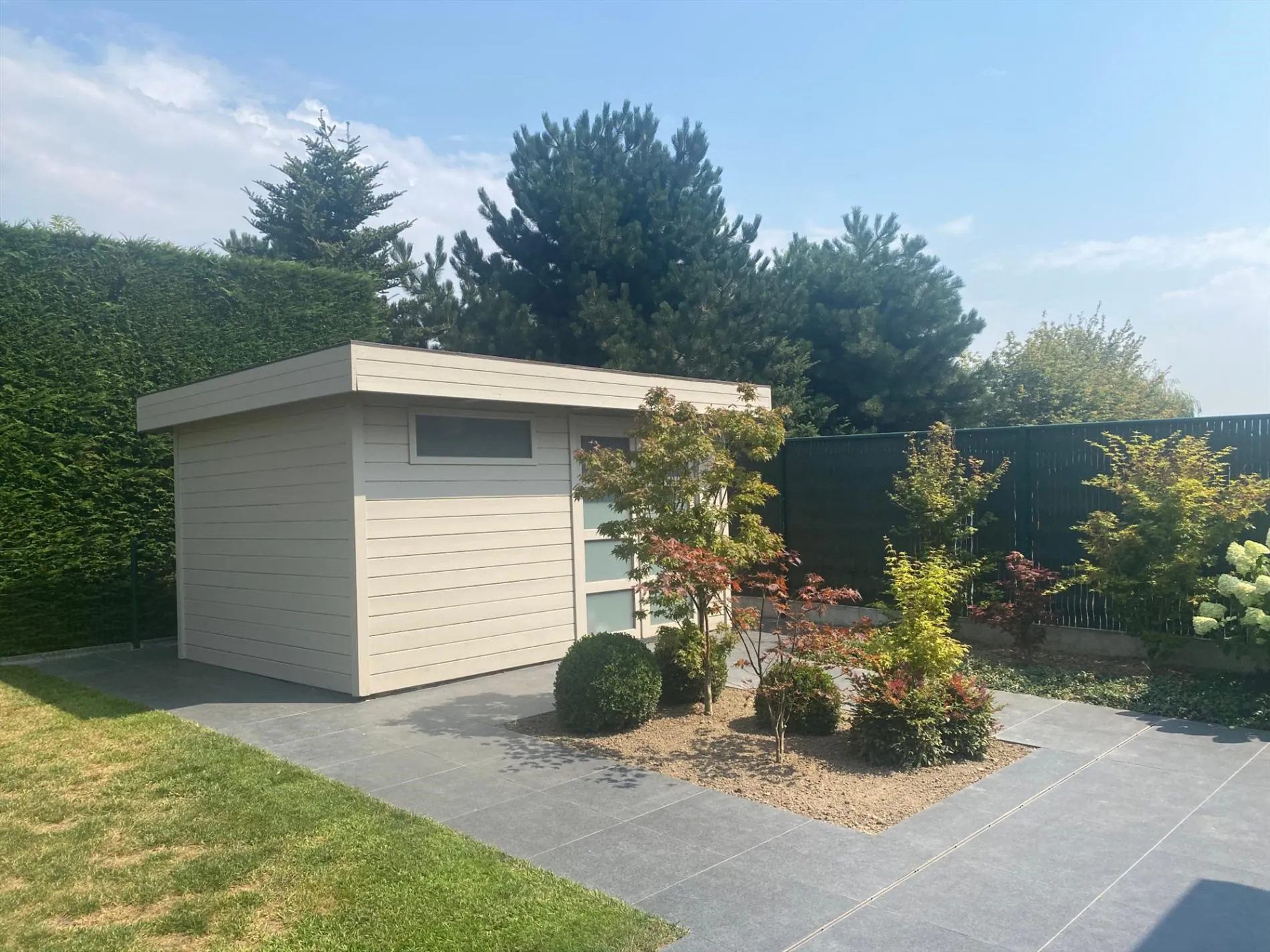 Verzorgde aangelegde tuin rondom de woning - oprit en terras - tuinhuis.