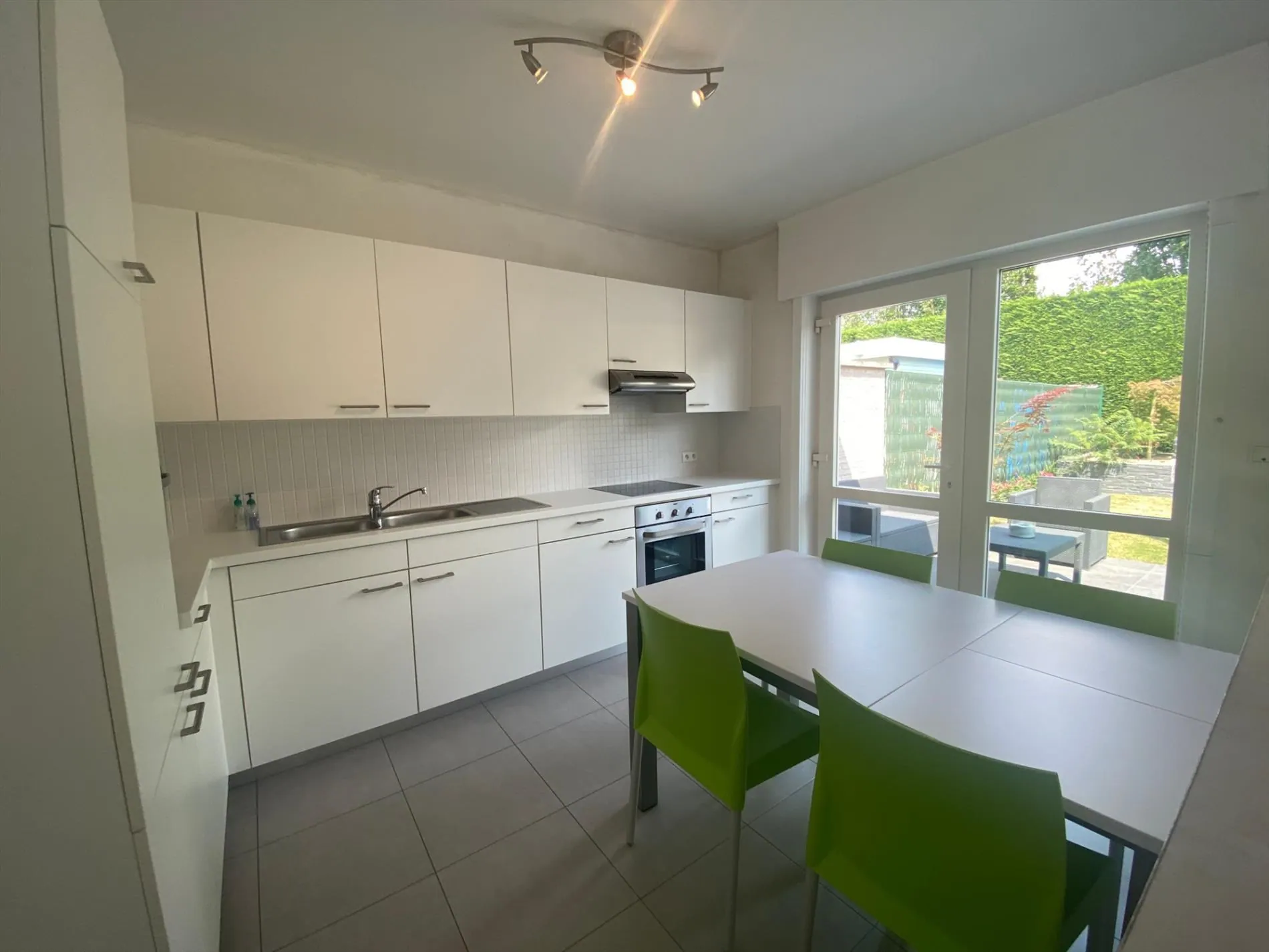 Gelijkvloers: inkomhal met gastentoilet - ruime leefruimte met zit- en eethoek - open volledig ingerichte keuken - ruime garage met elektrische sectionaalpoort.