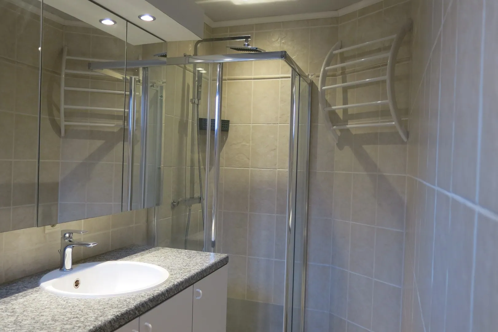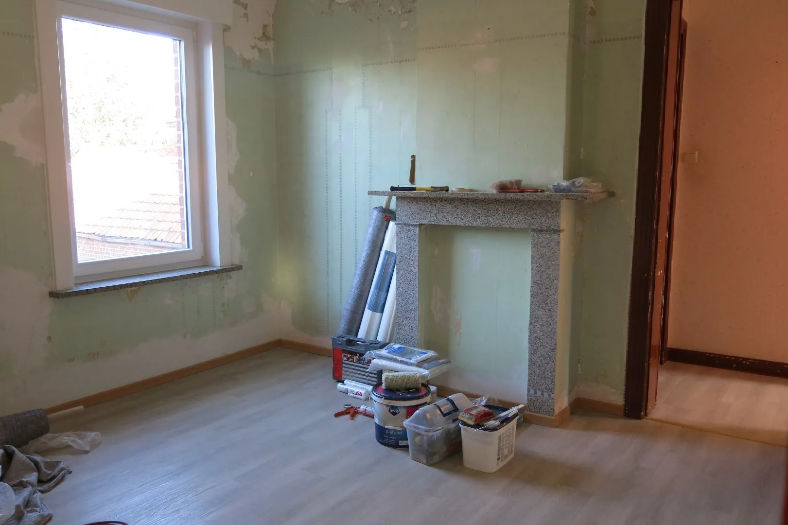 Gelijkvloers: inkomhal - leefruimte - zonnige leefkeuken - badkamer met douche, toilet en wastafel - ruime garage - buitenberging