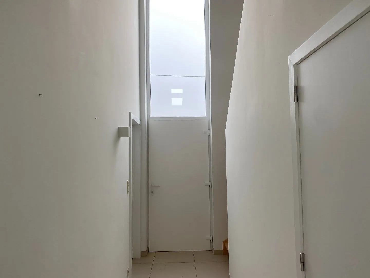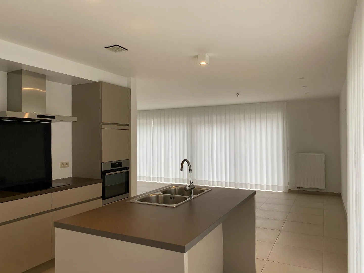 GLV: inkomhal - gastentoilet - bergruimte - leefruimte met open, volledig geïnstalleerde keuken.