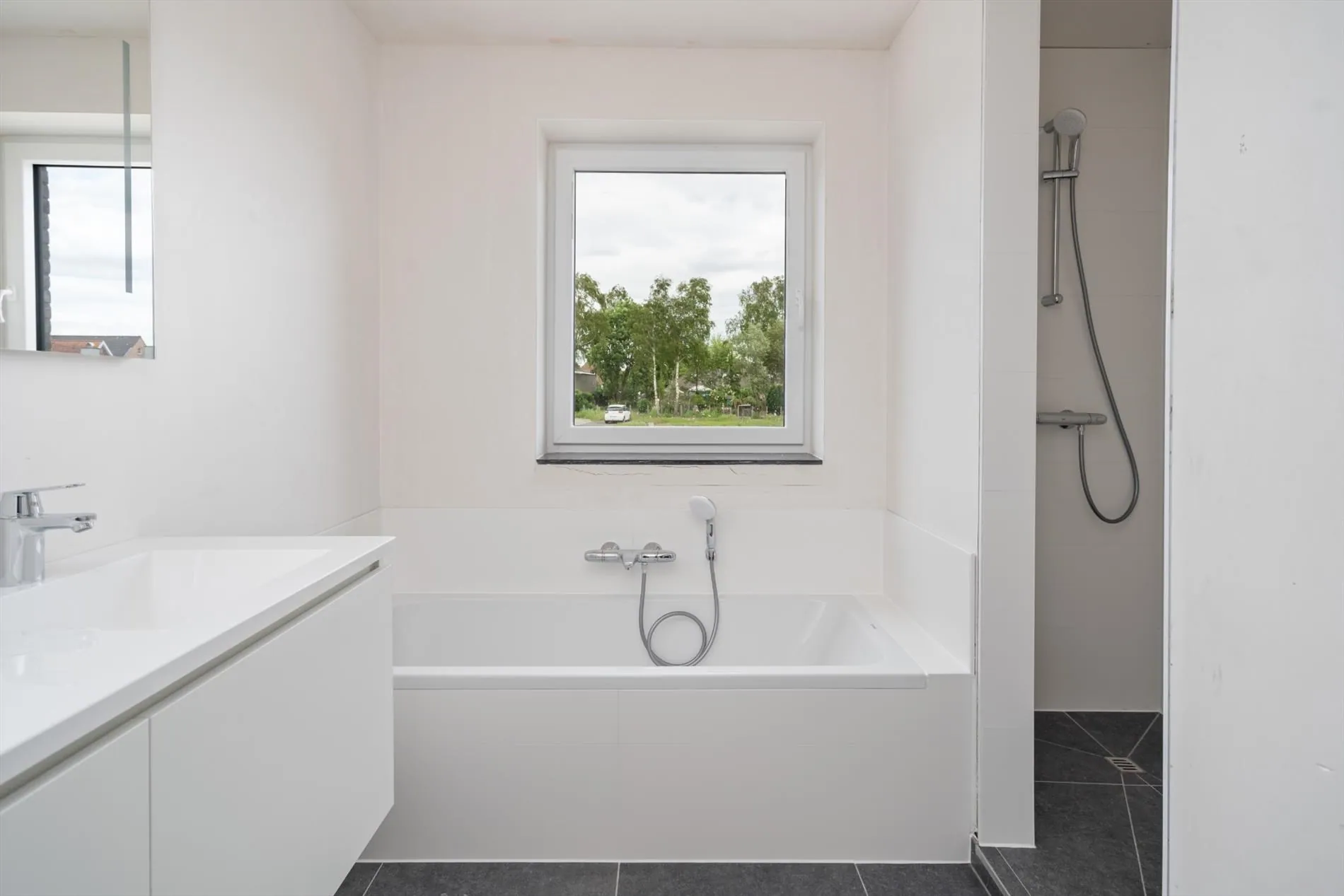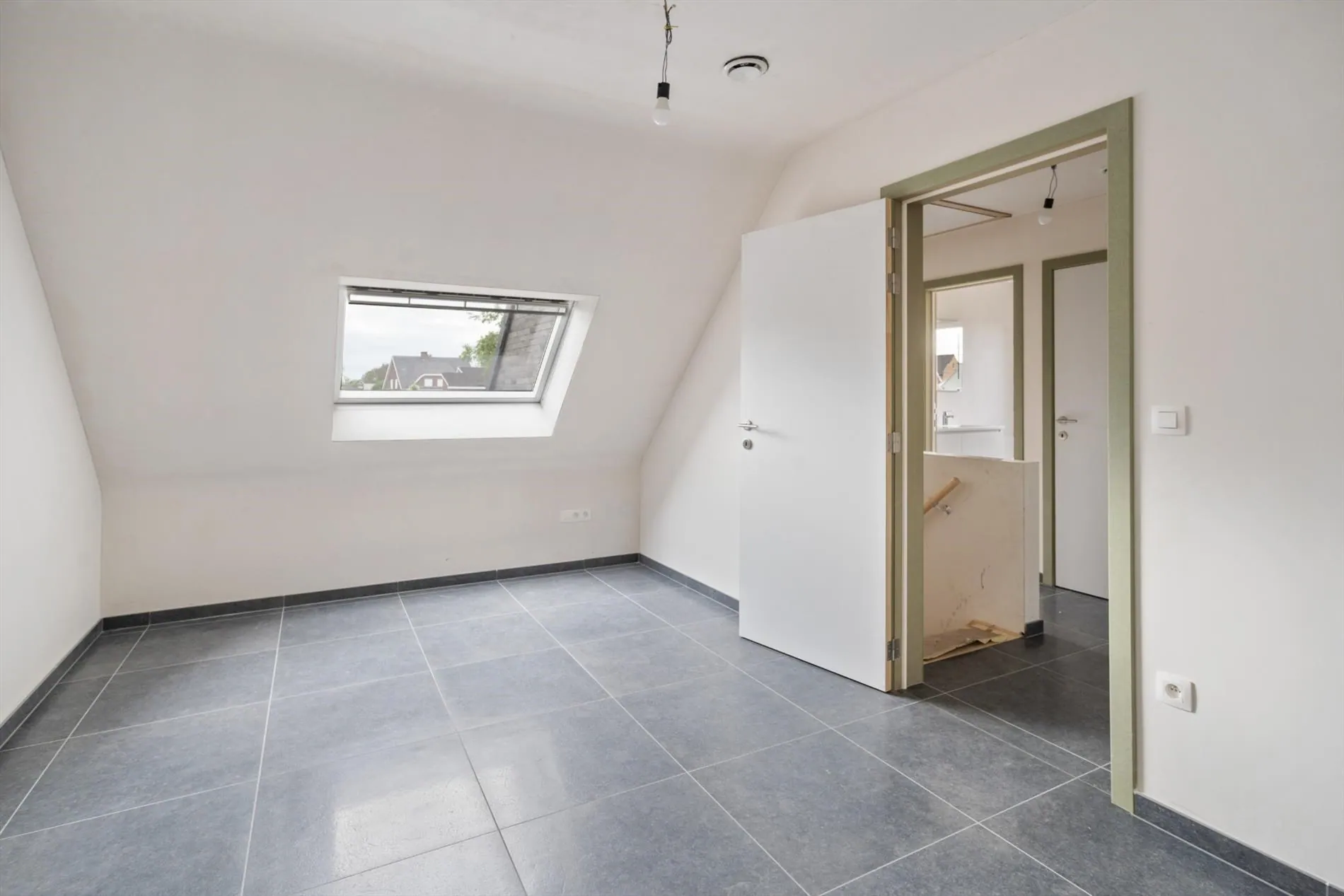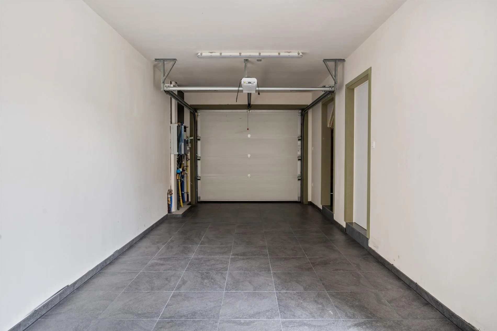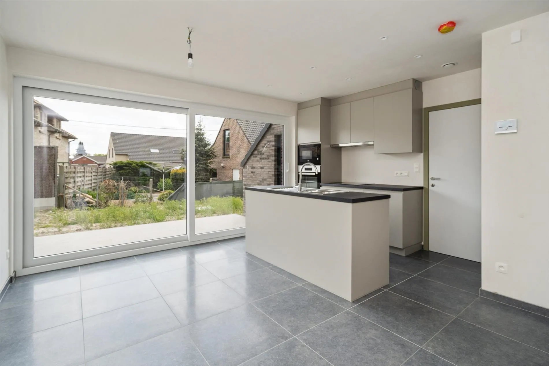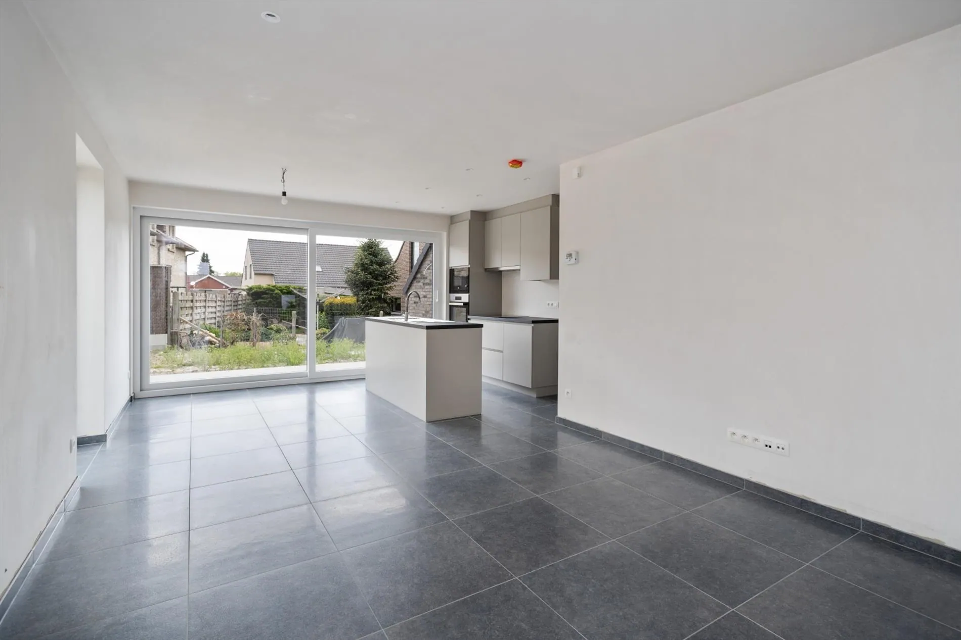 Gelijkvloers: inkomhal met apart gastentoilet - ruime leefruimte met open keuken concept - garage met aparte bergruimte - tuin.