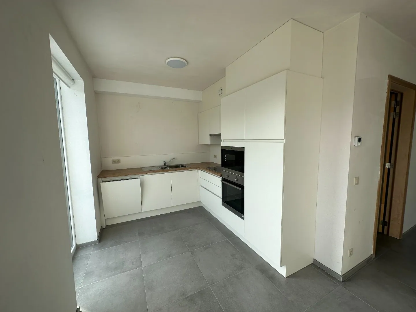 Gelijkvloers: inkomhal - toilet - leefruimte met open, ingerichte keuken - ruime berging