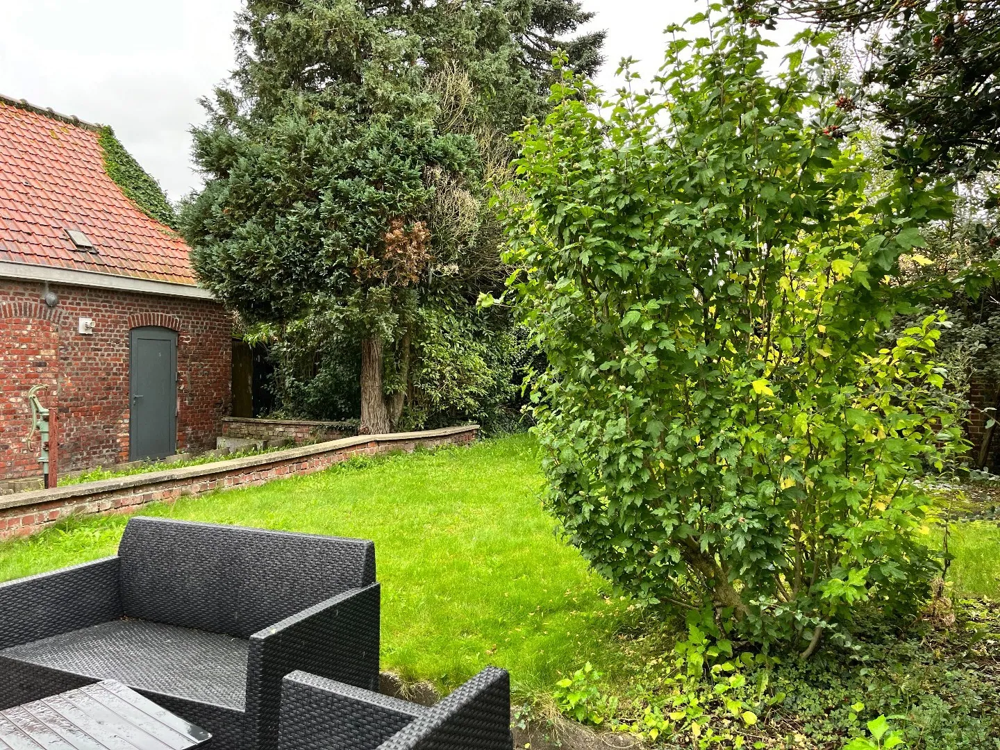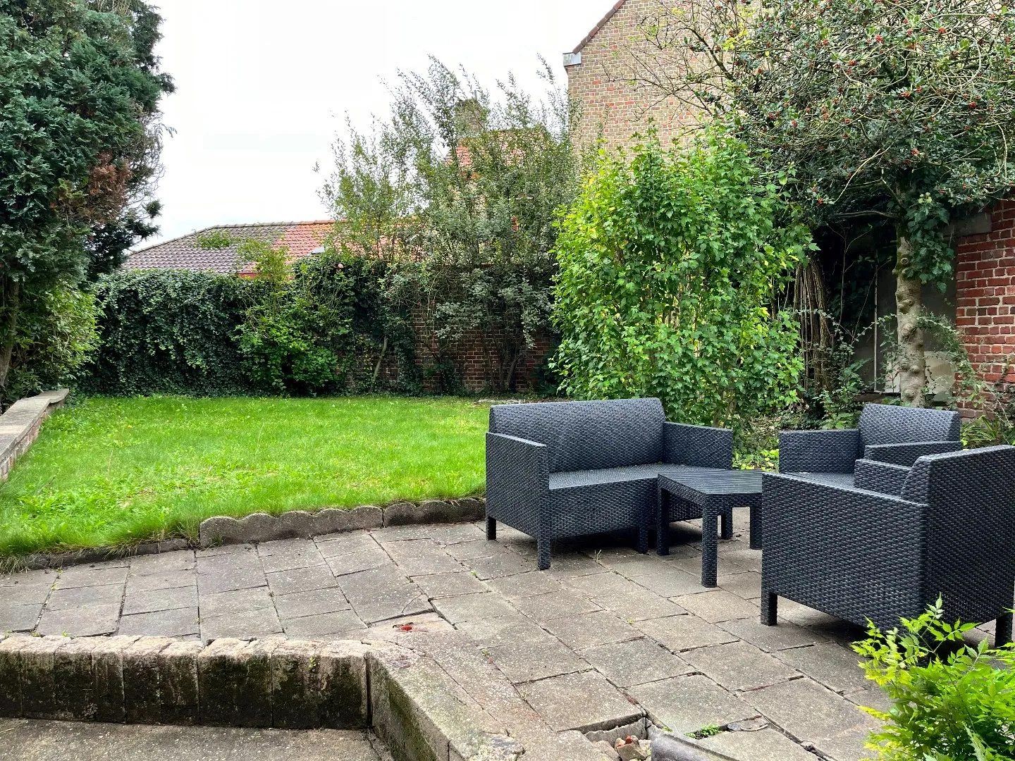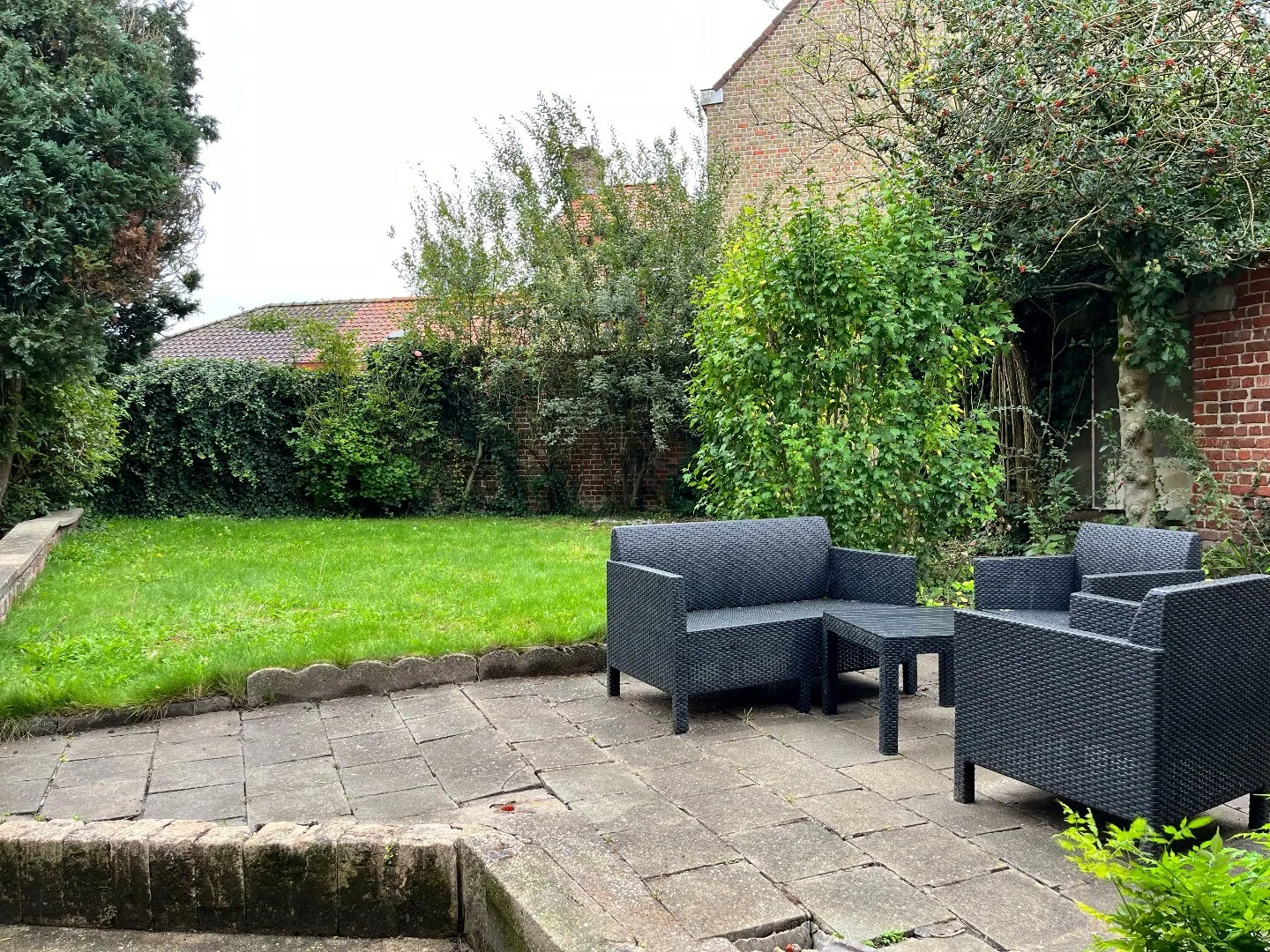 Gezellige tuin met toegang tot wasberging en garage.