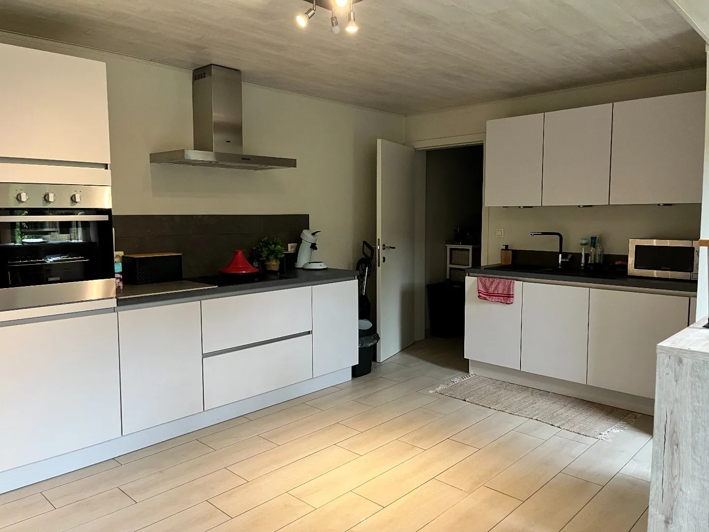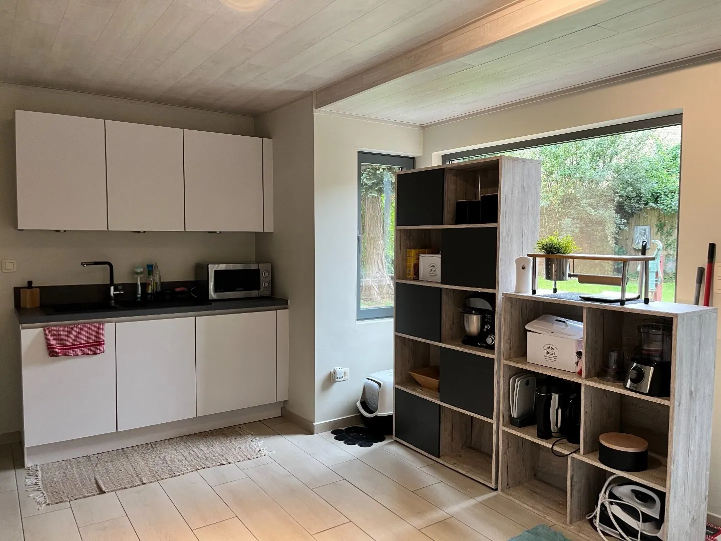 gelijkvloers: ruime inkomhal - leefruimte met zit en- eethoek - ruime, volledig ingerichte leefkeuken - badkamer met wastafel, douche en toilet - kelder.