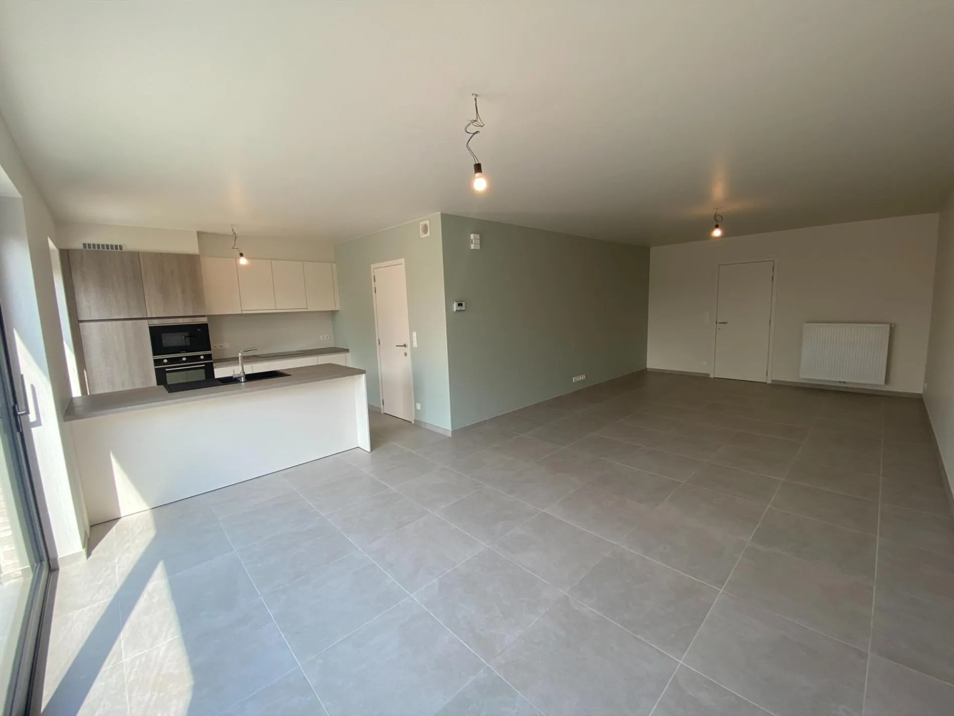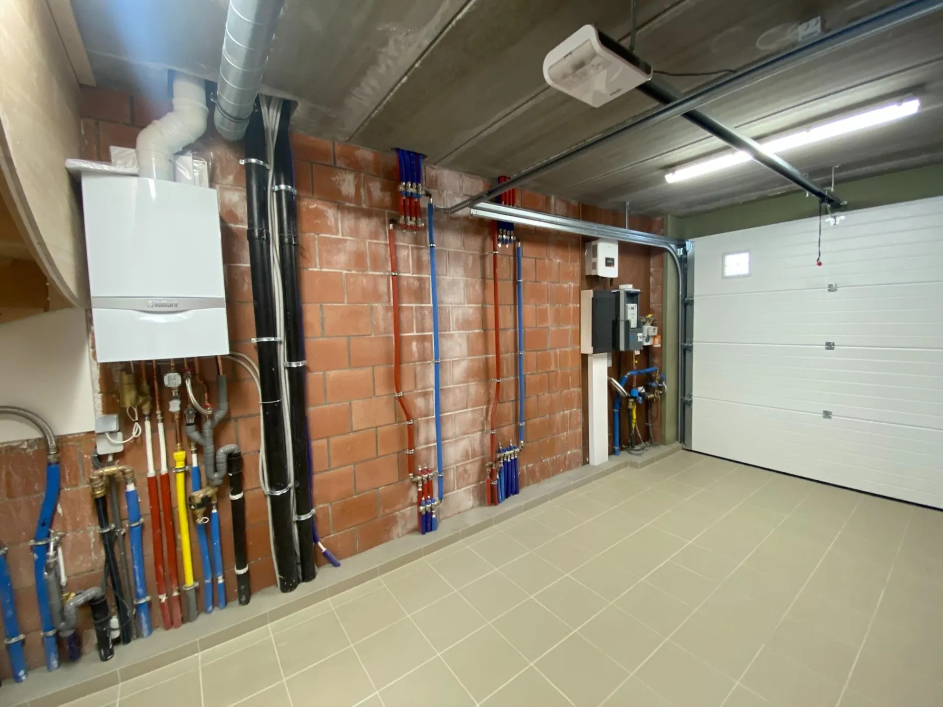 Gelijkvloers: ruime inkomhal met gastentoilet - leefruimte met volledig ingerichte keuken - traphal - garage met automatische poort