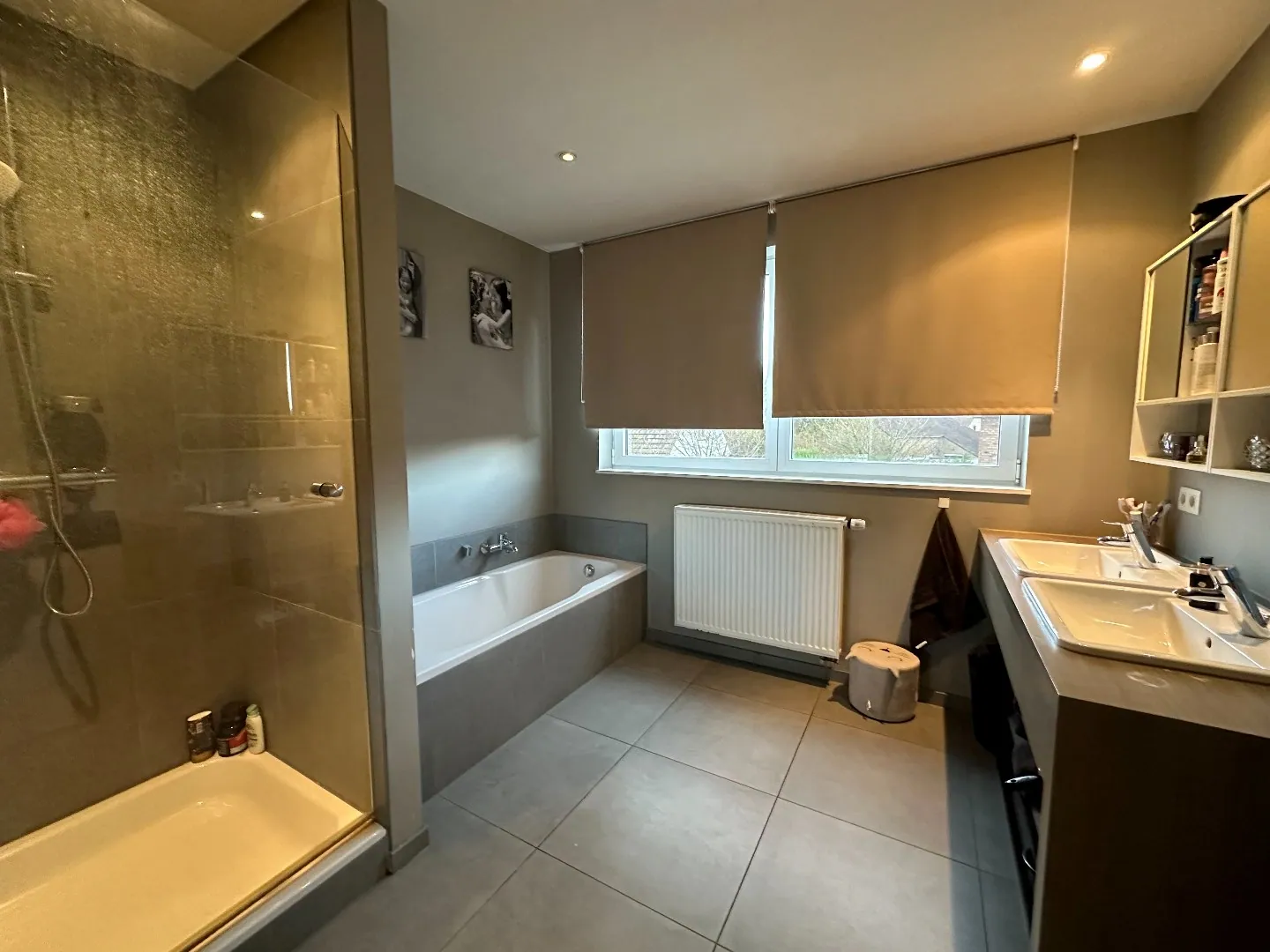 Verdieping: nachthal - 3 slaapkamers - badkamer met bad, douche en dubbele wastafel - toilet.