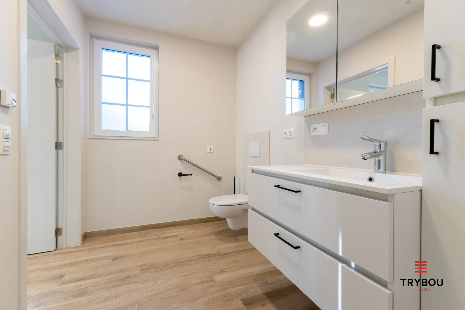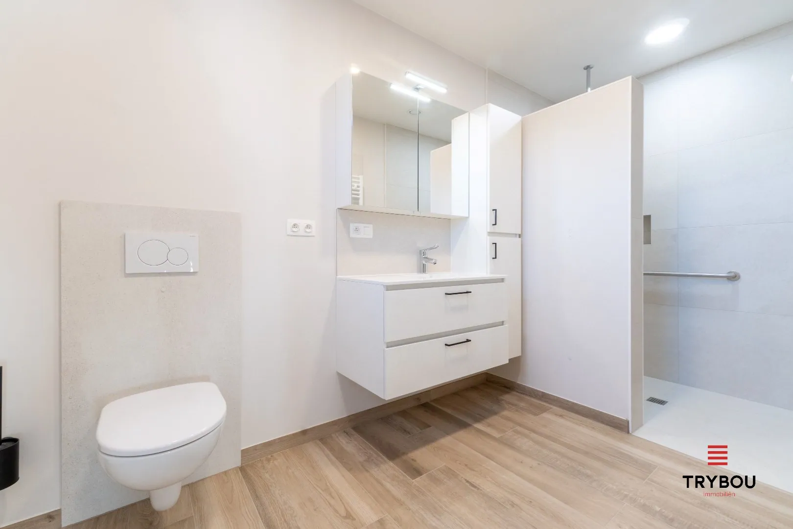 De slaapkamer sluit naadloos aan op de aangepaste badkamer, uitgerust met een inloopdouche, toilet en lavabomeubel. Dankzij de geïntegreerde domotica en strategisch geplaatste noodknoppen woon je hier met een gerust hart.