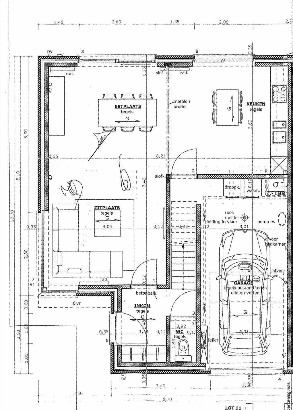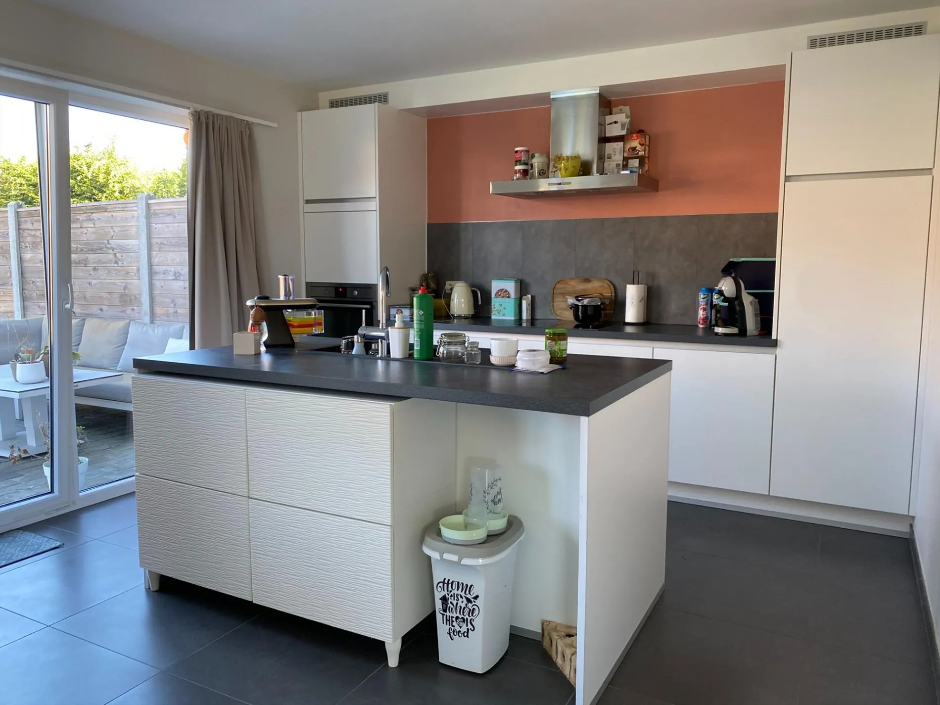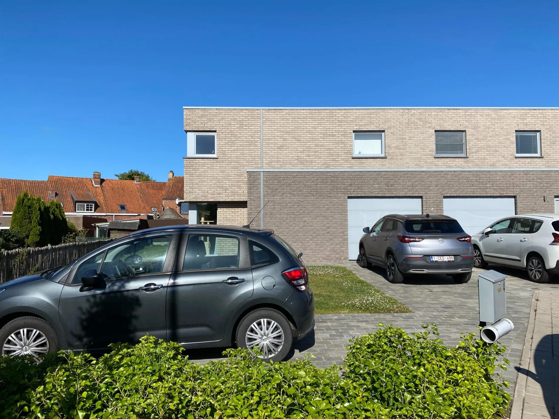 Gelijkvloers: inkomhal met gastentoilet - ruime leefruimte met open, ingerichte keuken - garage met automatische poort.