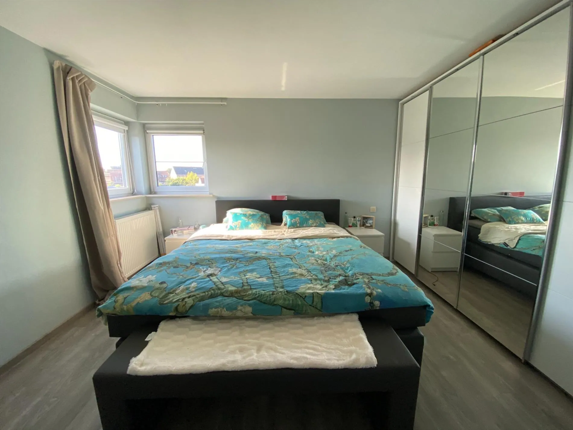 Verdieping: 3 slaapkamers - berging - badkamer met bad, douche, dubbele wastafel en toilet.