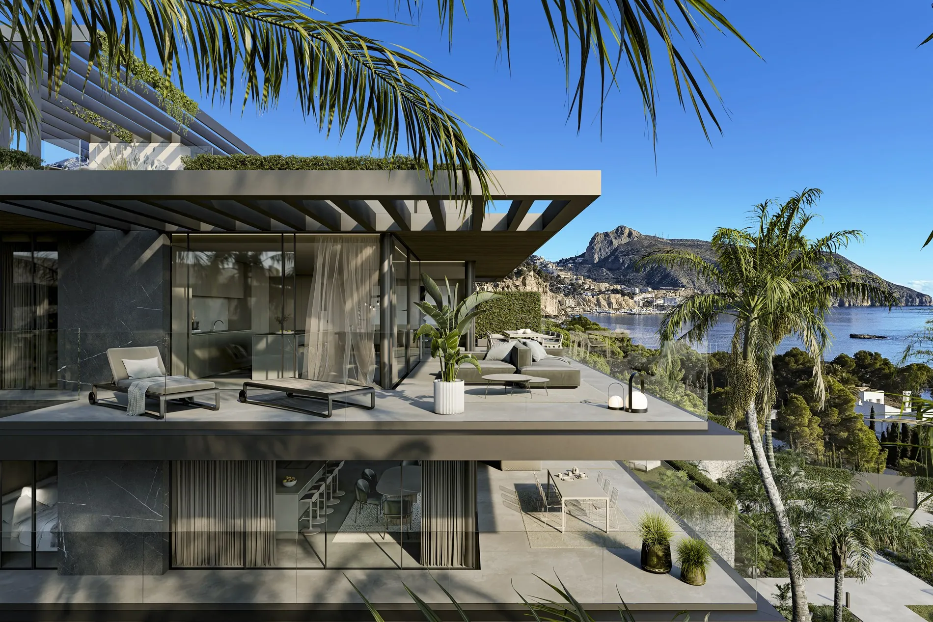 Deze schitterende appartementen liggen op slechts 500 meter van het strand en bieden een adembenemend 180° frontaal uitzicht op de Middellandse Zee. De moderne architectuur en grote glaspartijen zorgen ervoor dat het buitengevoel naadloos overloopt in het interieur. De royale terrasruimte van 79 m² nodigt uit tot het genieten van zonsopgangen en zonsondergangen, met een panoramisch uitzicht dat je elke dag opnieuw weet te verrassen.