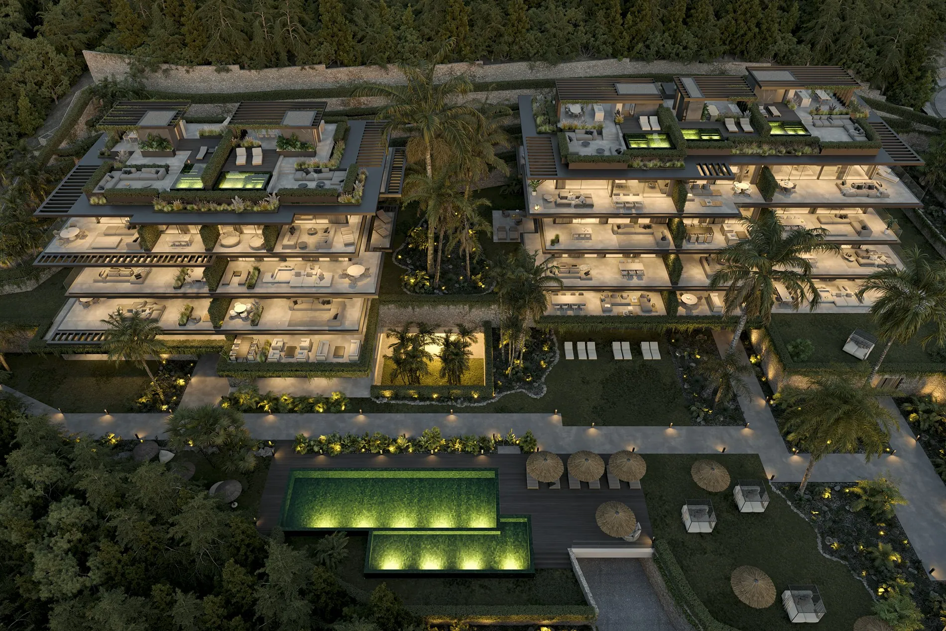 De appartementen beschikken over een open leefruimte met keuken, 3 slaapkamers en 2 badkamers, waarvan één en suite. Tot het comfort behoren ook 2 ondergrondse parkeerplaatsen en een berging. Bewoners genieten van talrijke gemeenschappelijke faciliteiten zoals een fitnessruimte, een verwarmd binnenzwembad, een spa, een sociale lounge, een kinderspeelplaats, aangelegde tuinen en een buitenzwembad.