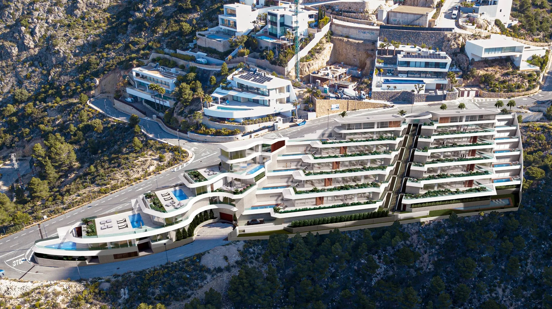 De residentie omvat zes ruime appartementen en twee indrukwekkende duplex penthouses, elk voorzien van een privézwembad, grote terrassen en twee ondergrondse parkeerplaatsen. Met drie tot vier slaapkamers, verfijnde afwerkingen en domotica-technologie, is elk detail ontworpen voor maximaal comfort. De woningen beschikken over vloerverwarming, airconditioning via kanalen, designkeukens met Silestone-werkblad en een ruime berging met wasruimte.