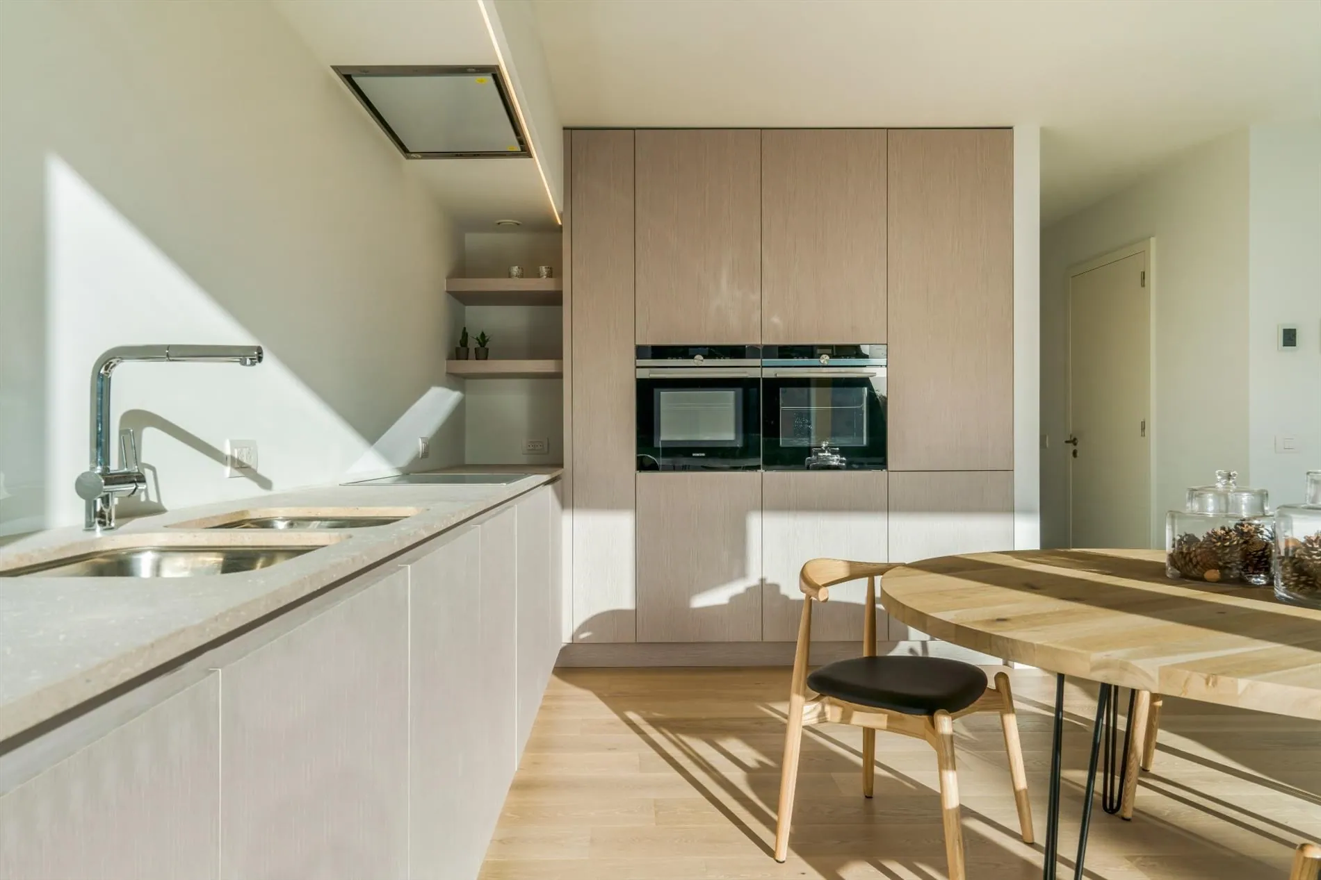 Deze buitengewone residentie, verdeeld over 4 bouwlagen, werd afgewerkt met duurzame en geselecteerde superieure materialen. De zuidgerichte terrassen vormen het verlengde van de leefruimte en bieden een intense buitenbeleving. De grote ramen zorgen bovendien voor een lichtrijk geheel die het buitengevoel ook in je woonkamer brengt.