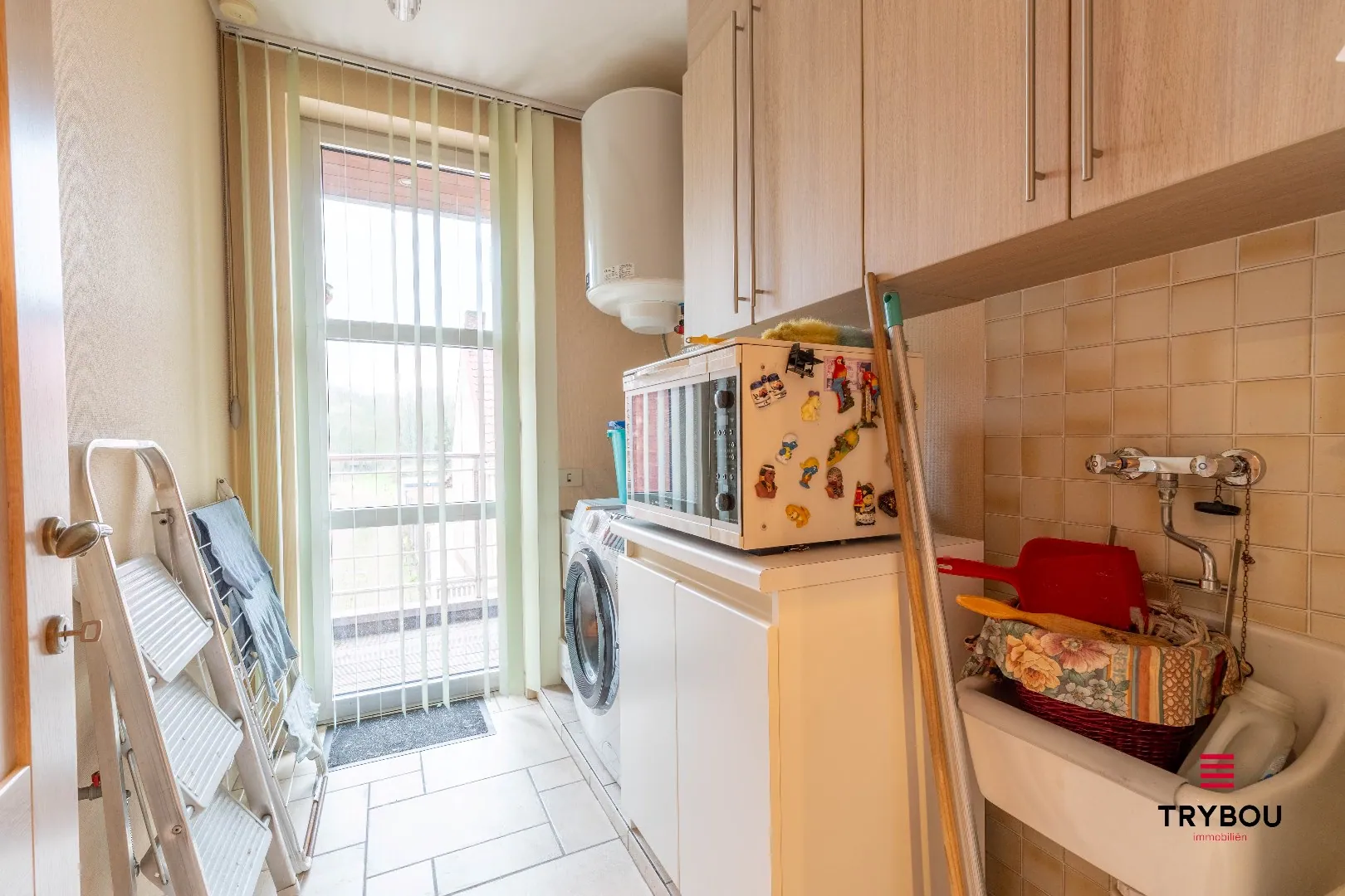 Inkomhal met gastentoilet - ruime, lichtrijke leefruimte met ingerichte open keuken - wasplaats - 2 ruime slaapkamers - badkamer met douche, wastafel en toilet - ruime berging.