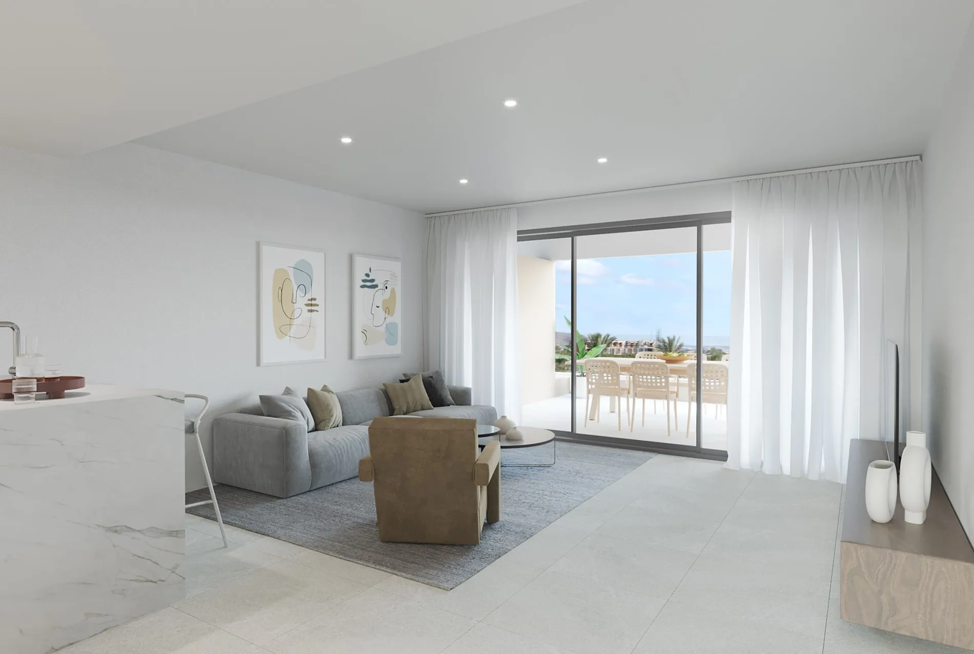 De appartementen bieden een slimme indeling met 2 slaapkamers en 2 badkamers, een open woonkamer met moderne Amerikaanse keuken en grote terrassen met uitzicht op de groene zones van het resort. Voor extra comfort zijn er opties zoals privé-tuinen op de begane grond en solaria bij de penthouses.