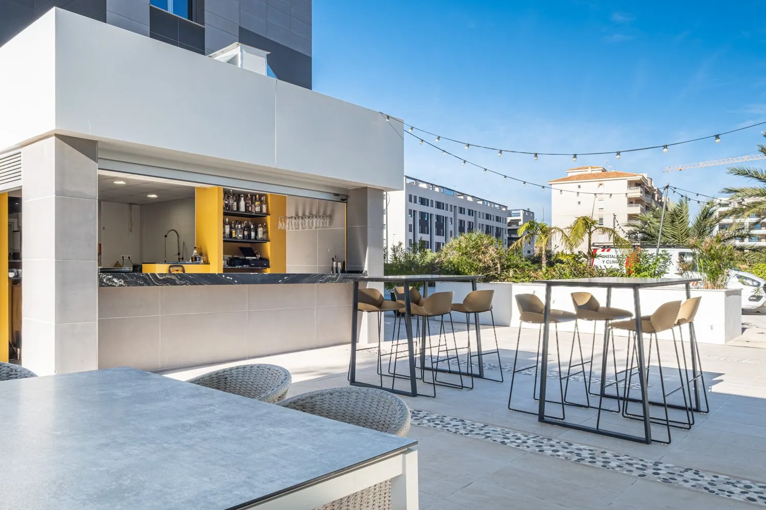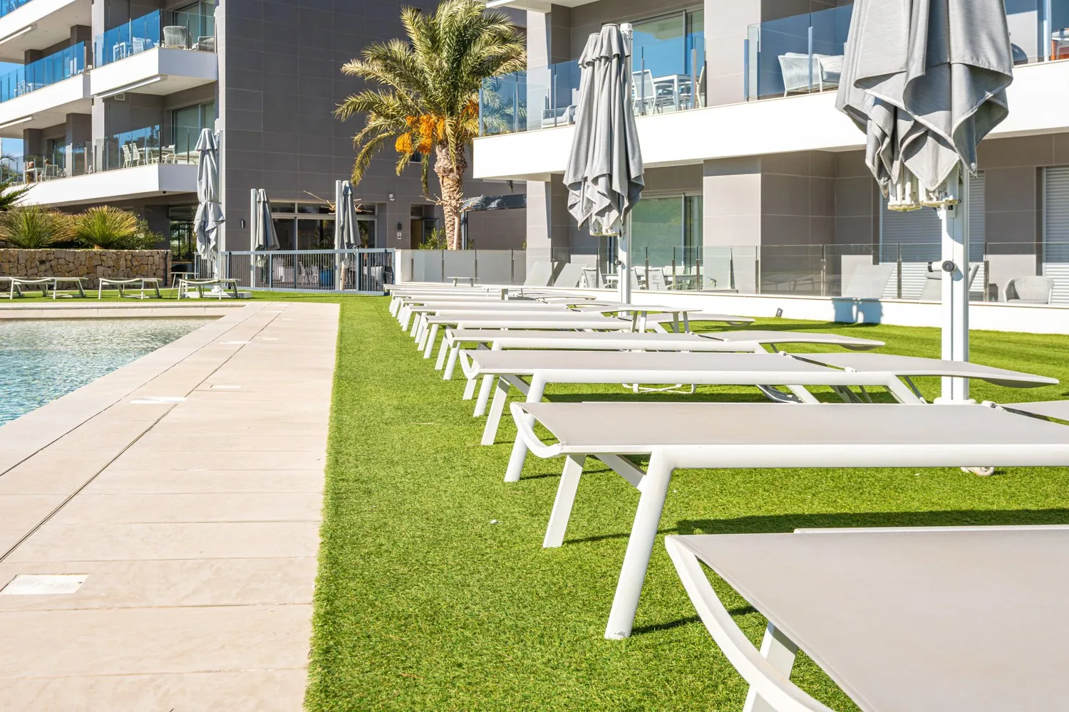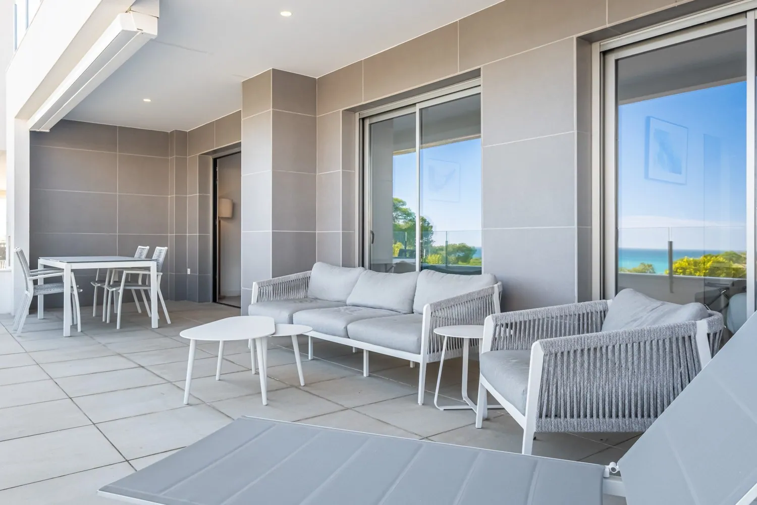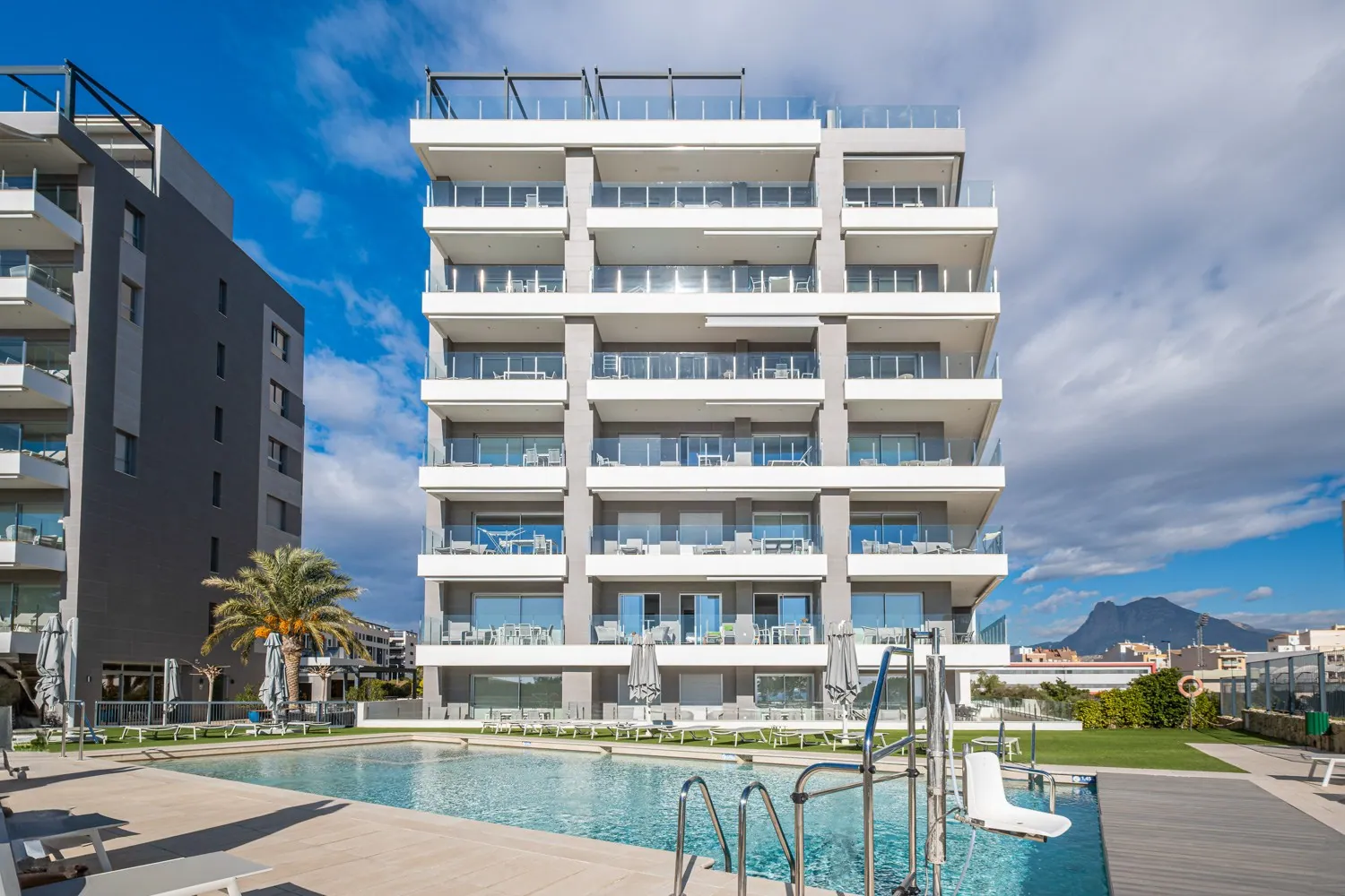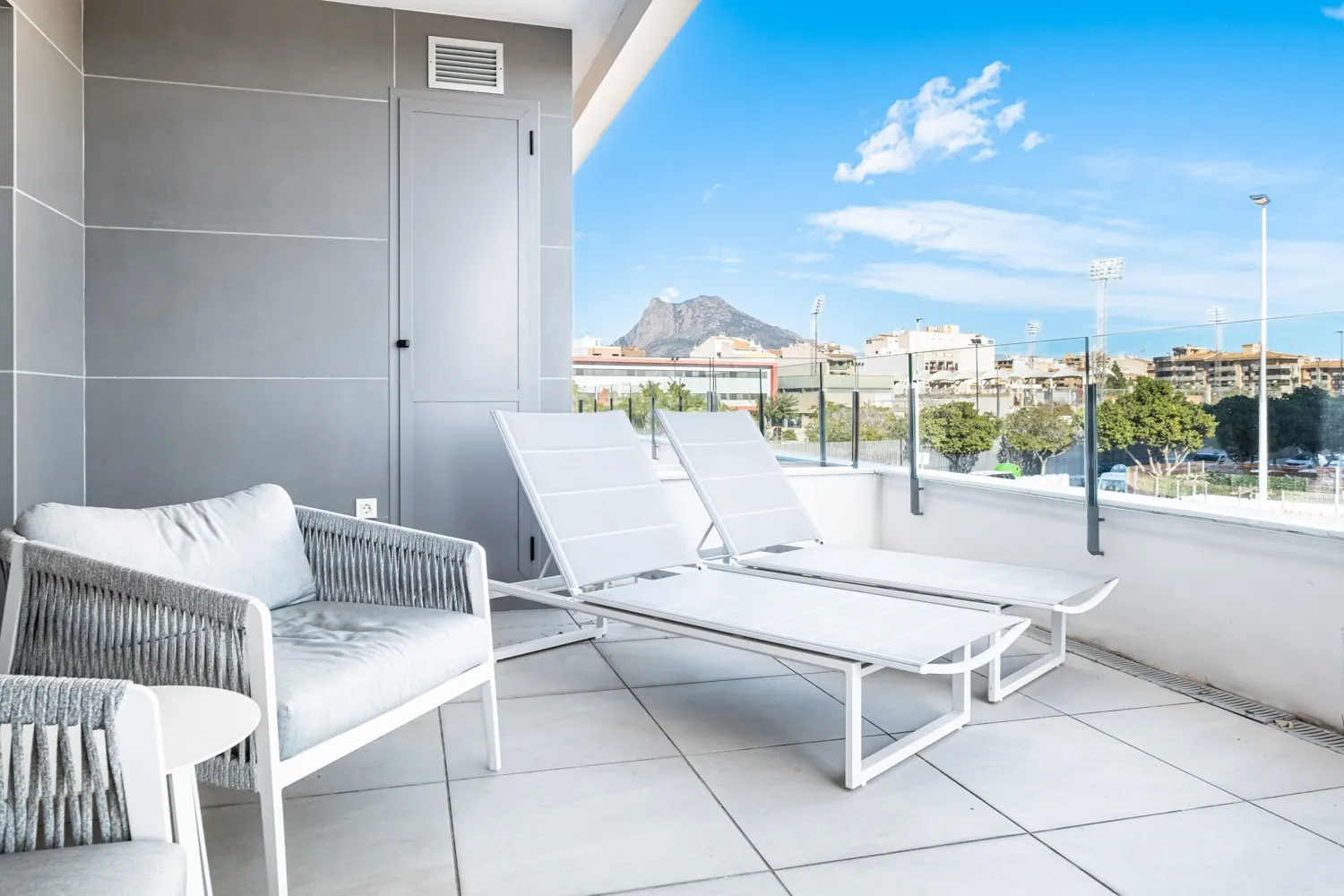 Blue Line B004 ligt op een unieke locatie, slechts 6 meter boven grondniveau en 25 meter boven zeeniveau, wat zorgt voor een oninneembaar uitzicht op de Middellandse Zee. Vanuit zowel de living als beide slaapkamers heb je directe toegang tot het dubbele terras van 35 m², waar je optimaal kunt genieten van de omgeving.