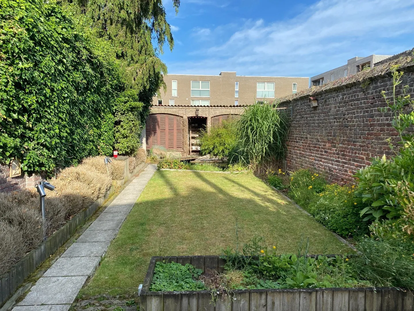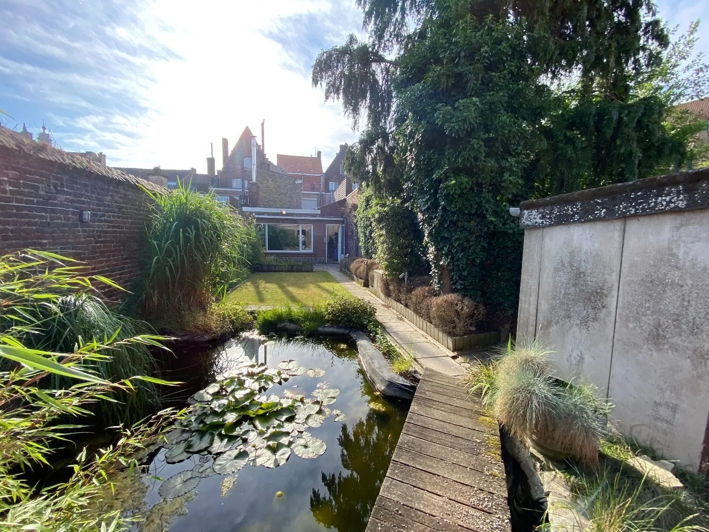 Gezellige stadstuin met visvijver en zonneterras.