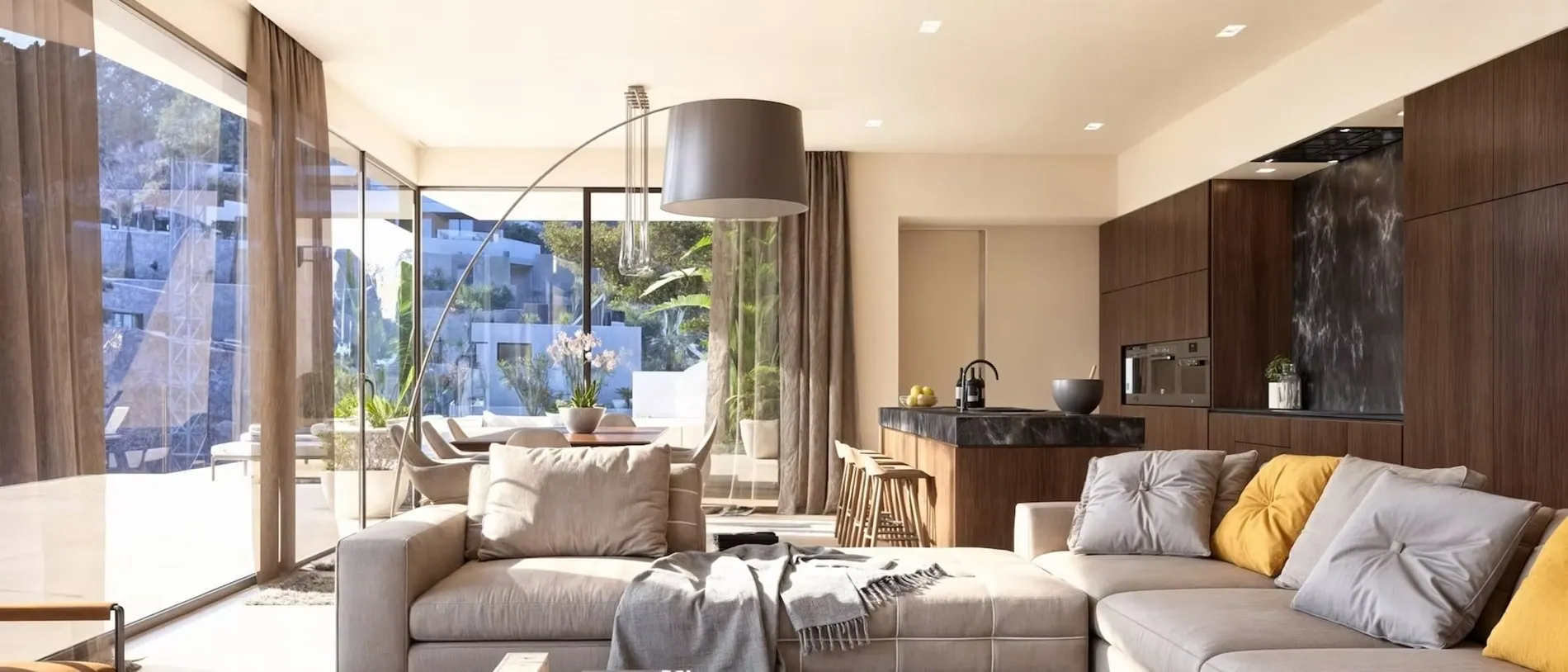 De open woon- en eetkamer sluit naadloos aan op een volledig uitgeruste designkeuken met hoogwaardige apparatuur. Grote terrassen en het schitterende infinity zwembad creëren een luxueuze buitenruimte, ideaal om te ontspannen, te zonnebaden of te genieten van sfeervolle diners bij zonsondergang.
