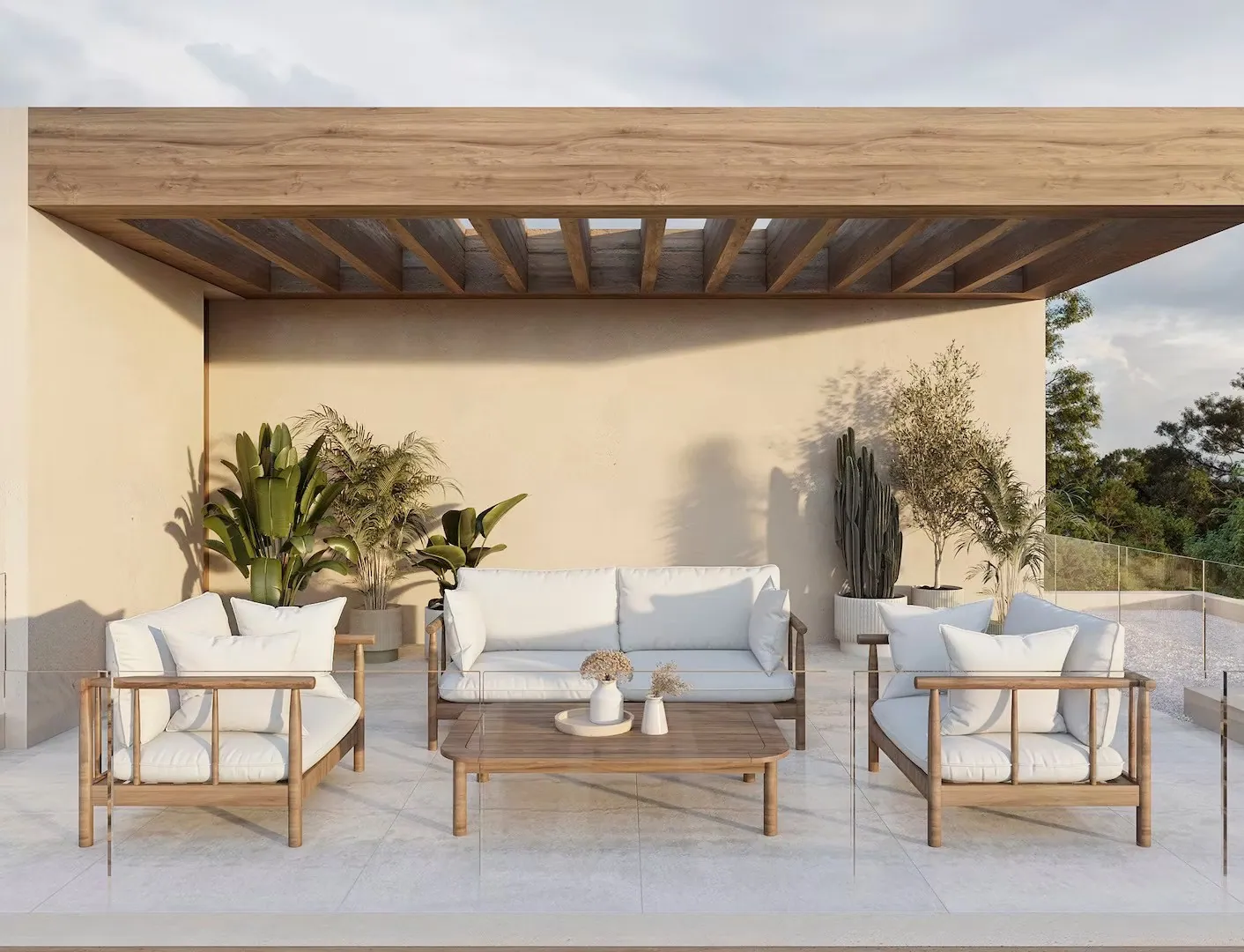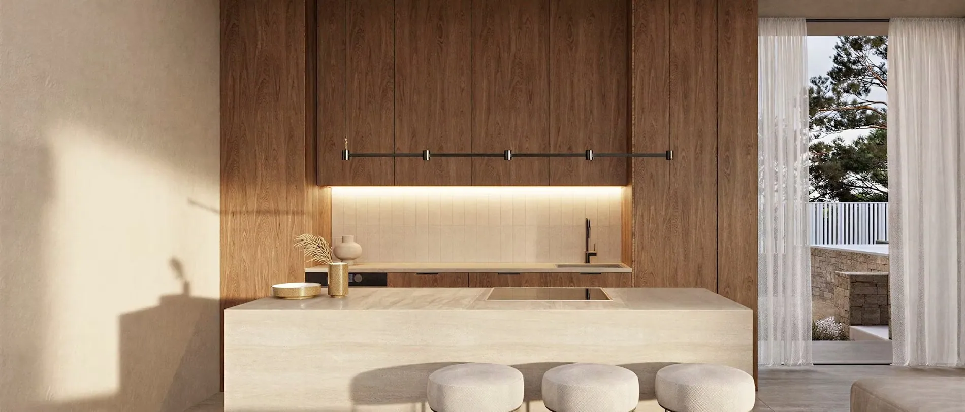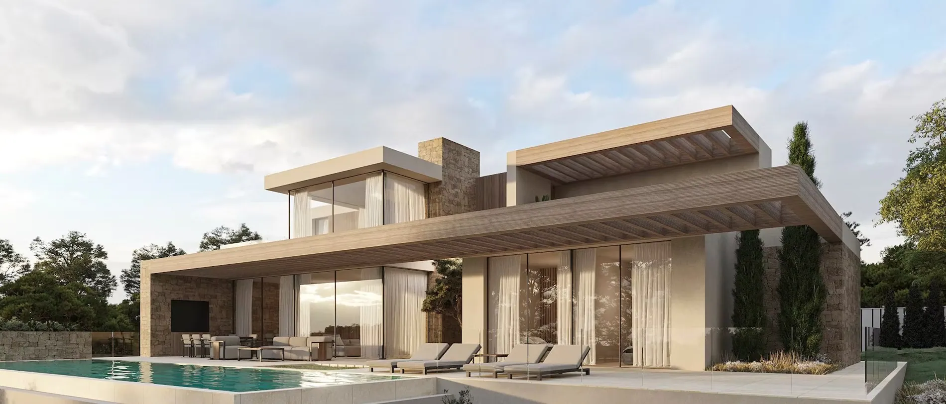 De villa werd ontworpen door een gerenommeerd architect en straalt moderne mediterrane luxe uit dankzij het gebruik van natuursteen, hout en zachte neutrale tinten. Grote raampartijen van vloer tot plafond zorgen voor een overvloed aan natuurlijk licht en creëren een perfecte harmonie tussen de binnenruimtes en de buitenomgeving. De architectuur sluit naadloos aan bij het omliggende kustlandschap en benadrukt het exclusieve karakter van deze woning.
