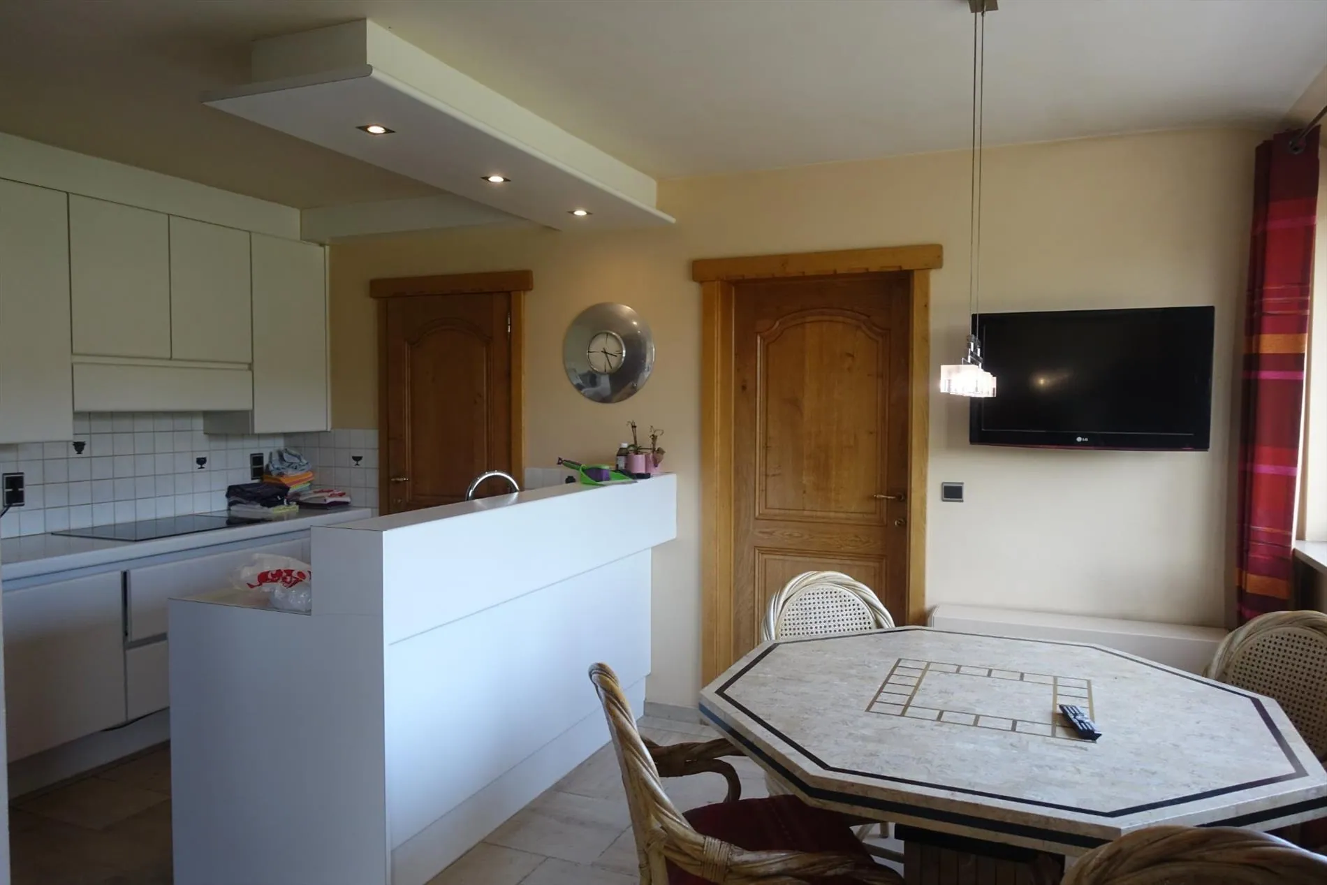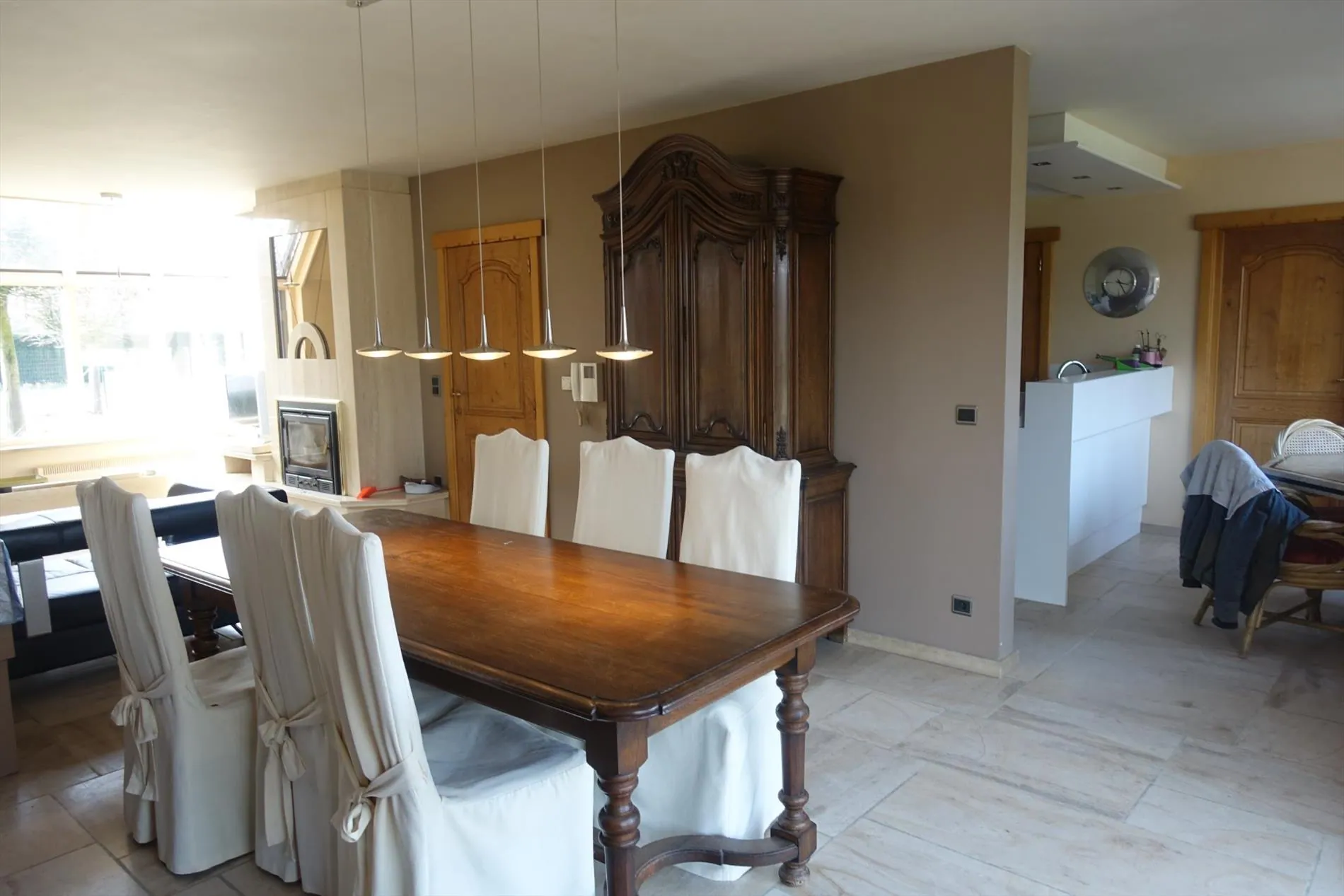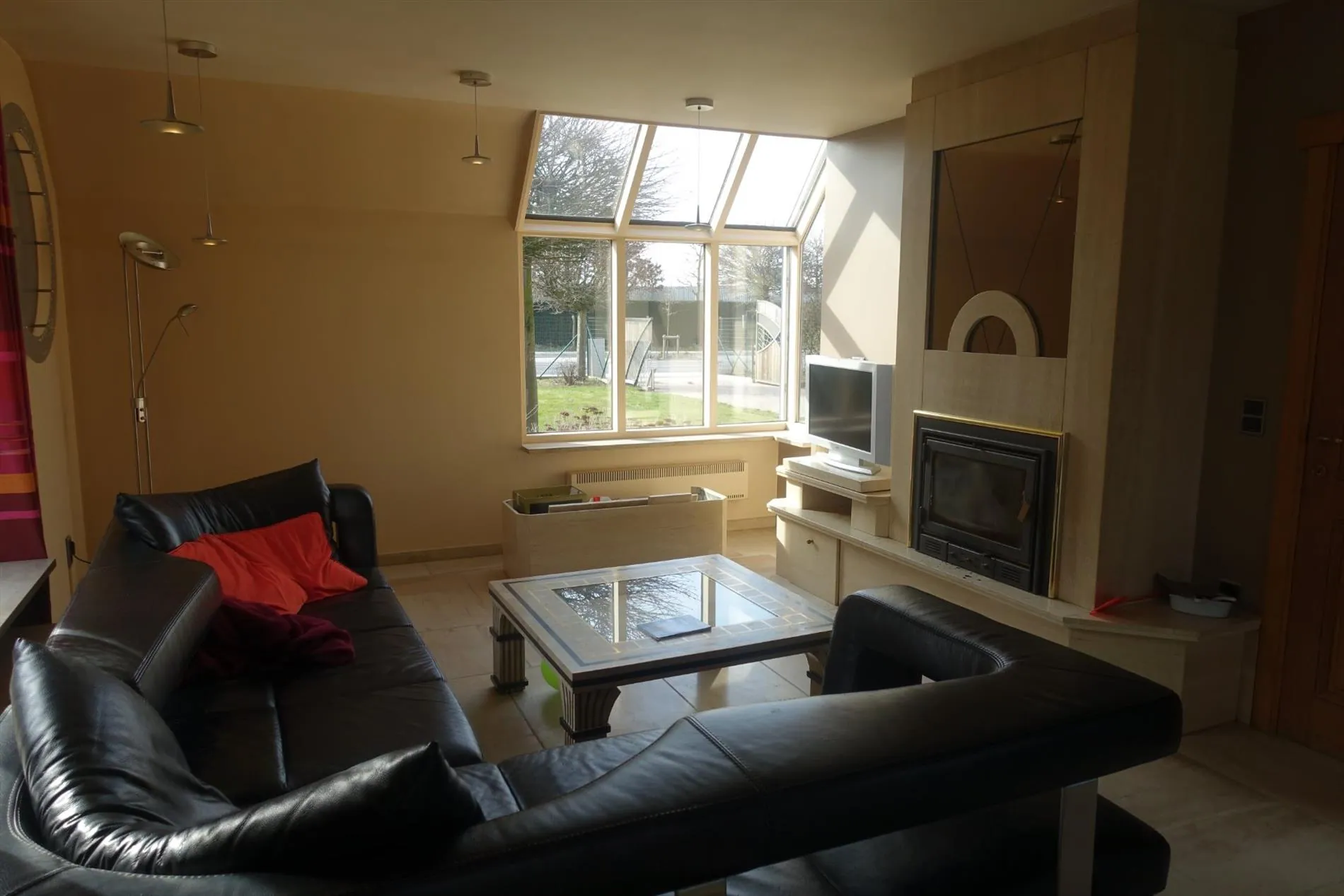 Gelijkvloers: Inkomhal met gastentoilet - ruime leefruimte met sfeerhaard - ingerichte keuken met eethoek - achterinkom - wasplaats met douche - ruime garage.