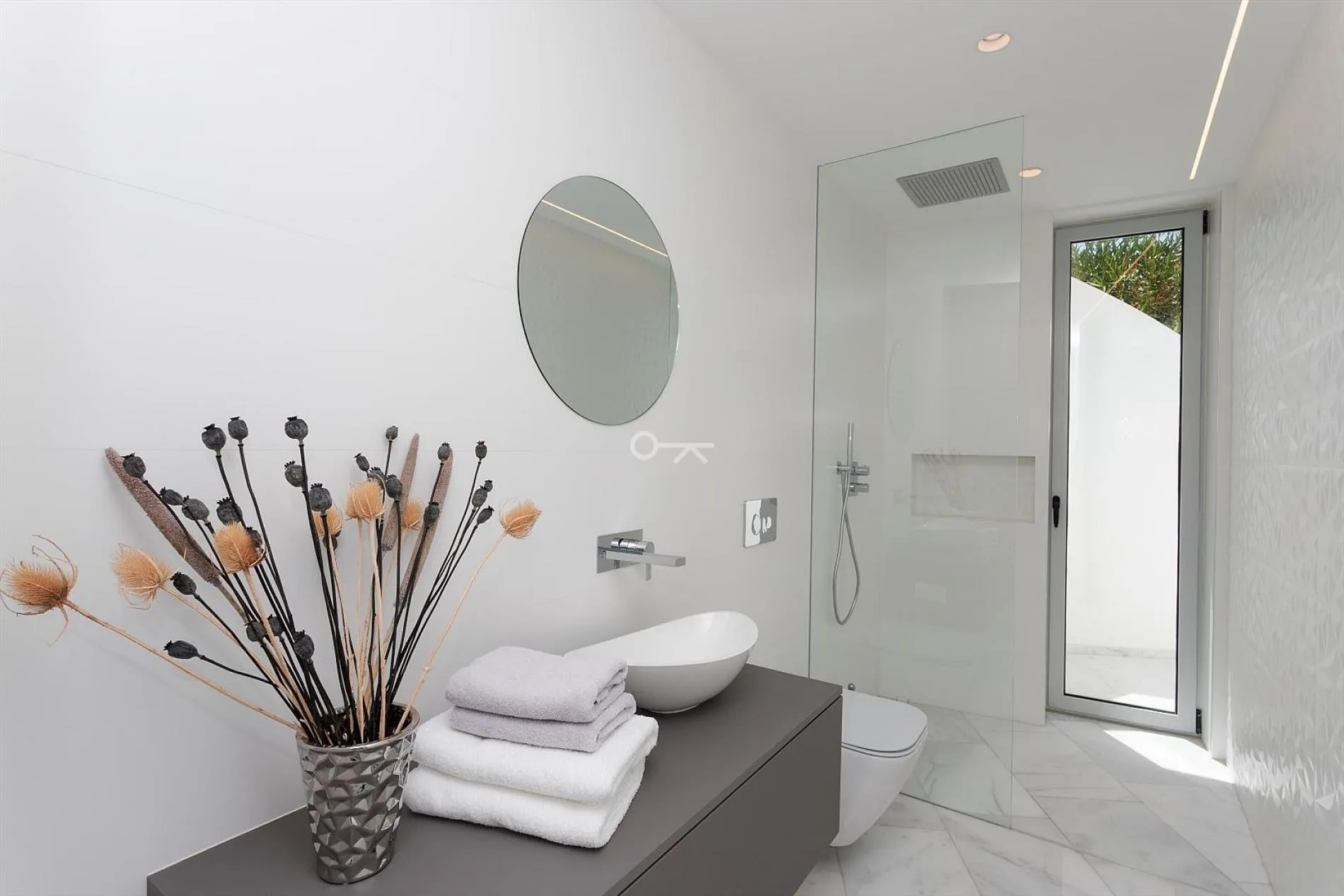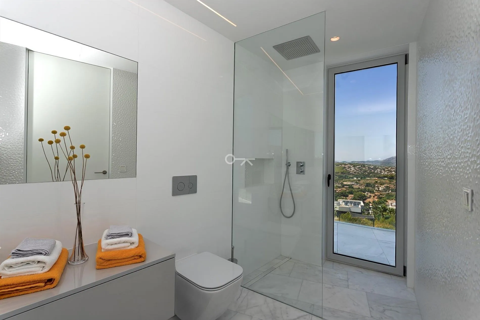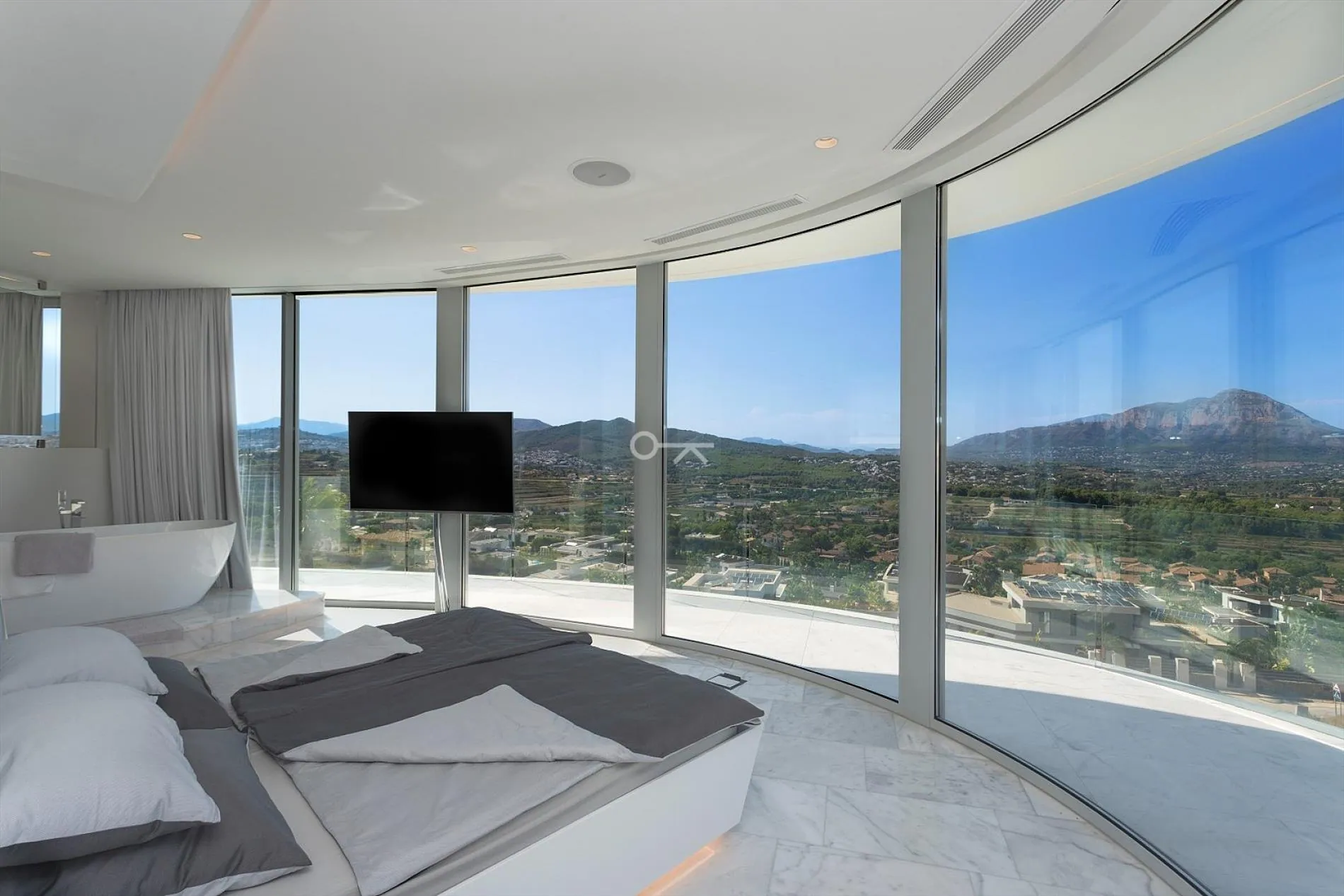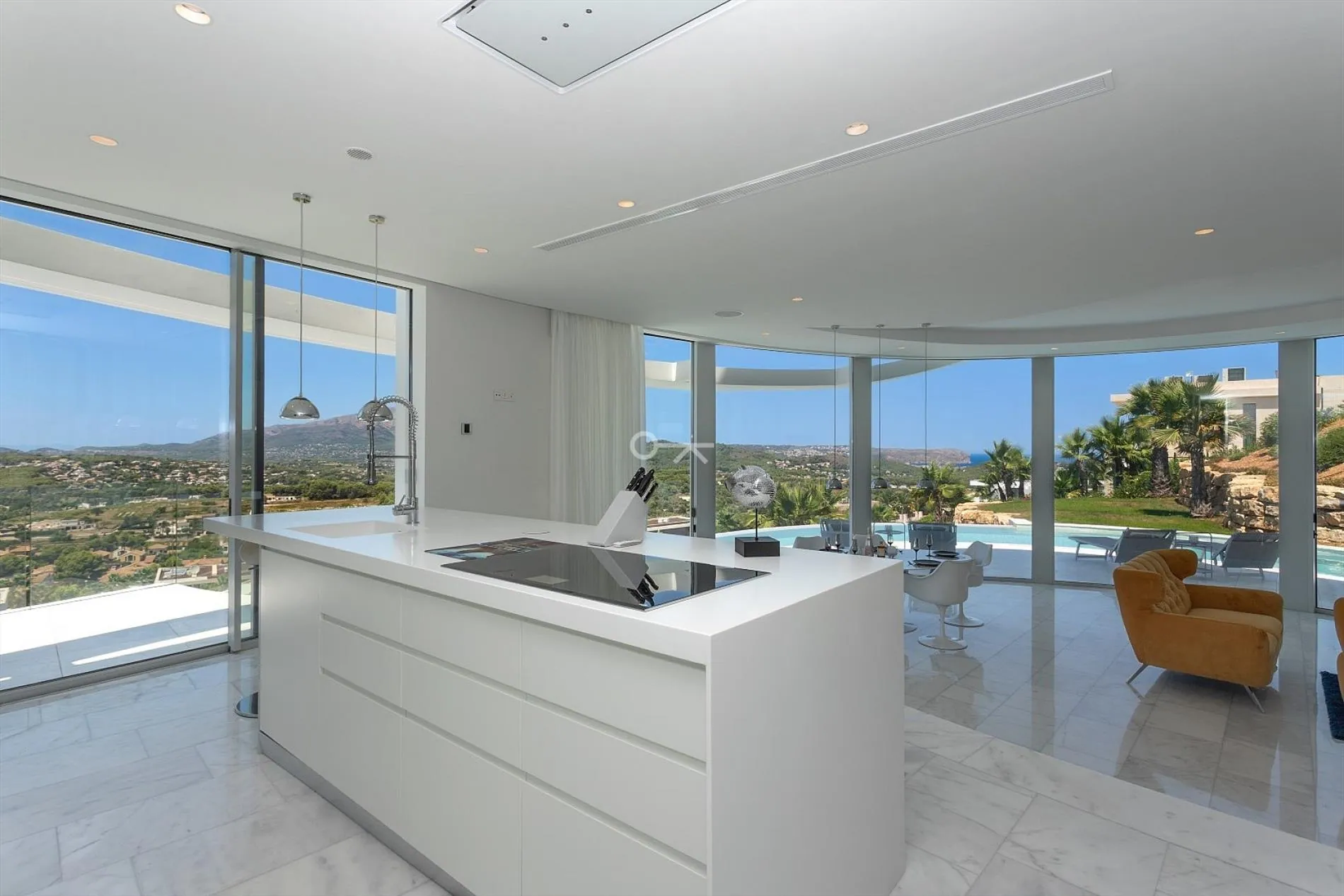 Gelegen op een perceel van 2.000 m2, past dit moderne huis van 550 m2 naadloos in de schilderachtige omgeving. Dit gebied wordt gekenmerkt door de grote groene gebieden, de schoonheid van het uitzicht op de berg Montgó en het uitzicht op de Middellandse Zee. Vanwege de verhoogde ligging op een heuvel geniet het pand van epische zonsondergangen en een adembenemend panoramisch uitzicht op de zee en het idyllische mediterrane landschap. De overvloed aan glas laat natuurlijk licht binnen en zorgt voor deze prachtige uitzichten vanuit elke hoek van het huis.