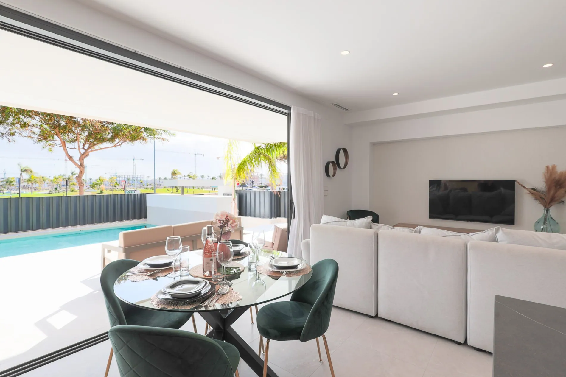 Elke woning beschikt over een modern ontwerp met 3 ruime slaapkamers en 3 badkamers, een open woon- en eetkamer, en een volledig uitgeruste keuken. Geniet van een privézwembad met waterval en een zonnig solarium, ideaal voor ontspanning. De villa’s zijn afgewerkt met hoogwaardige materialen, zoals een gepantserde voordeur, vloerverwarming, airconditioning en een domotica-systeem.