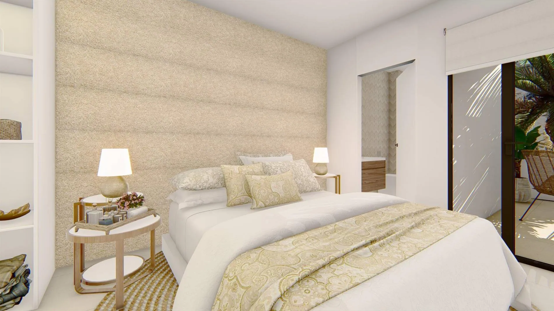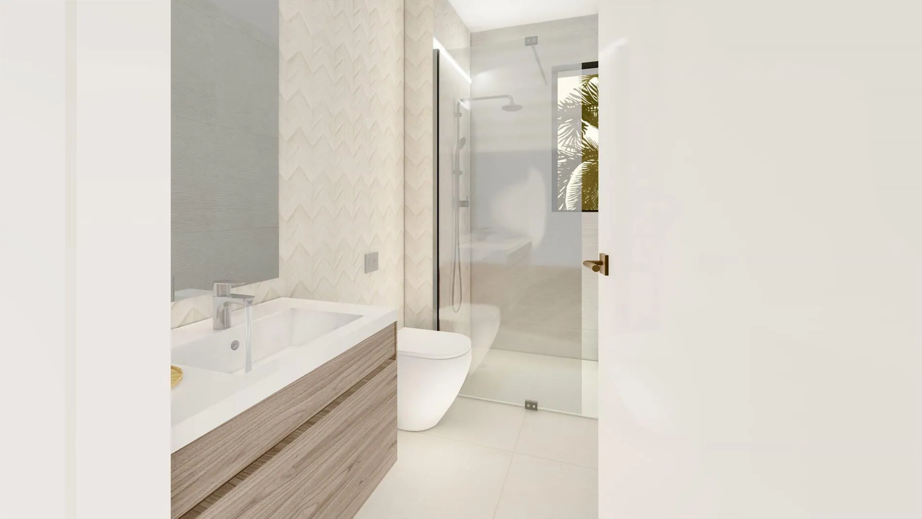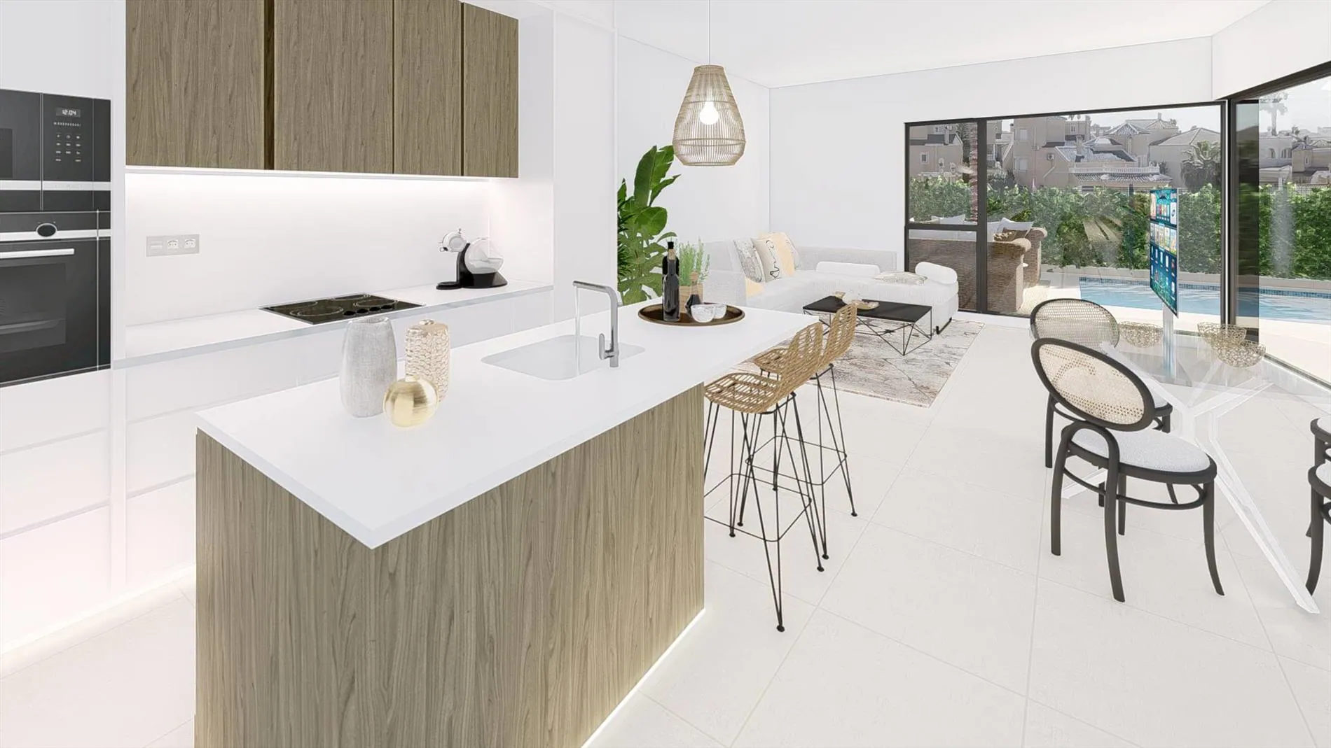 Er zijn 3 slaapkamers, waarvan 2 en-suite, en 3 badkamers. Verder ook een open keuken die verder loopt naar de woonkamer en toegang geeft tot een groot, half overdekt terras en zwembad.