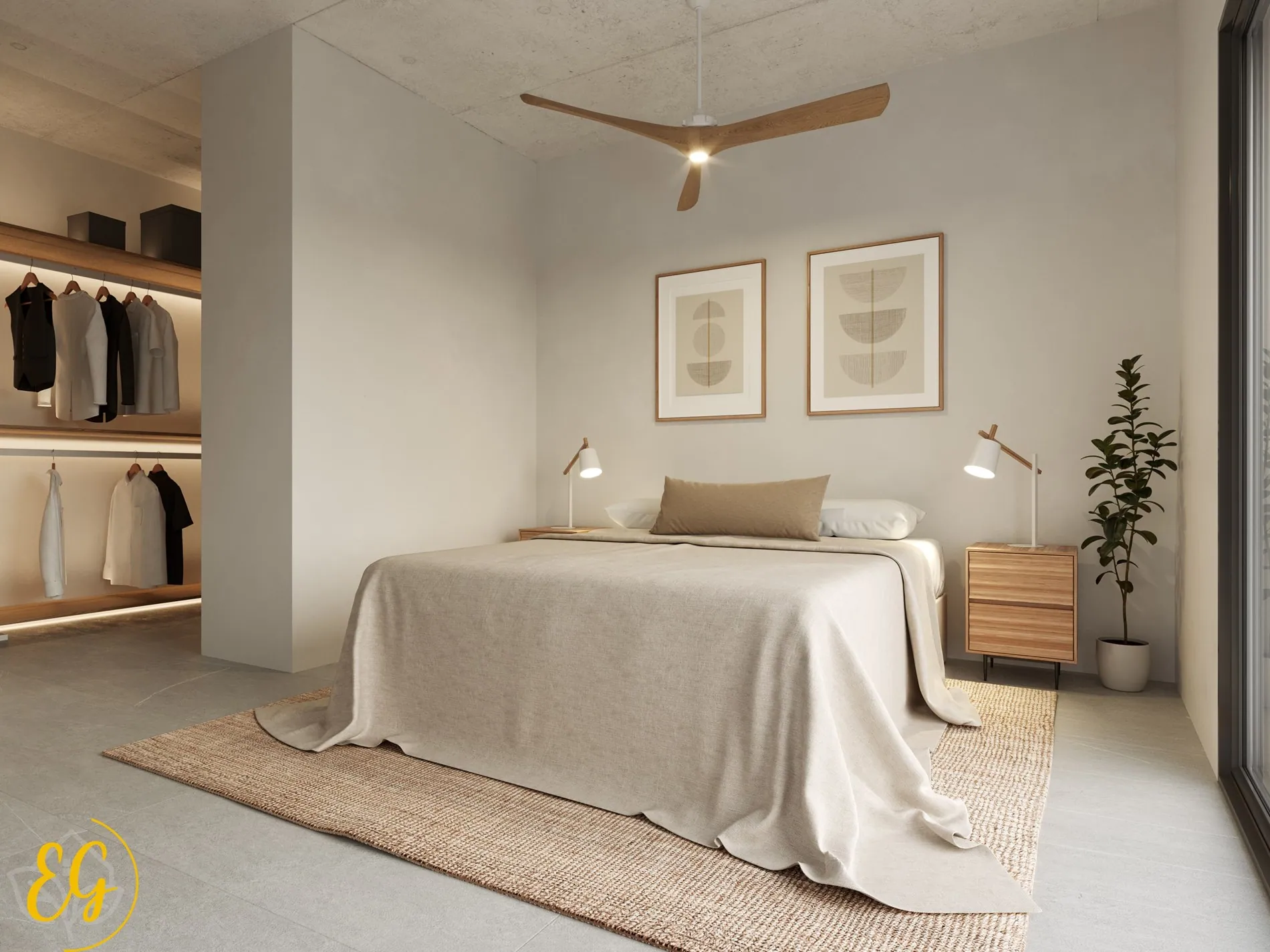 Elke woning beschikt over drie ruime slaapkamers met ingebouwde kasten, twee badkamers, een grote woon-eetkamer met open keuken, en meerdere terassen inclusief een solarium. De hoofdslaapkamer bevindt zich op het gelijkvloers en beschikt over een eigen badkamer en dressing.