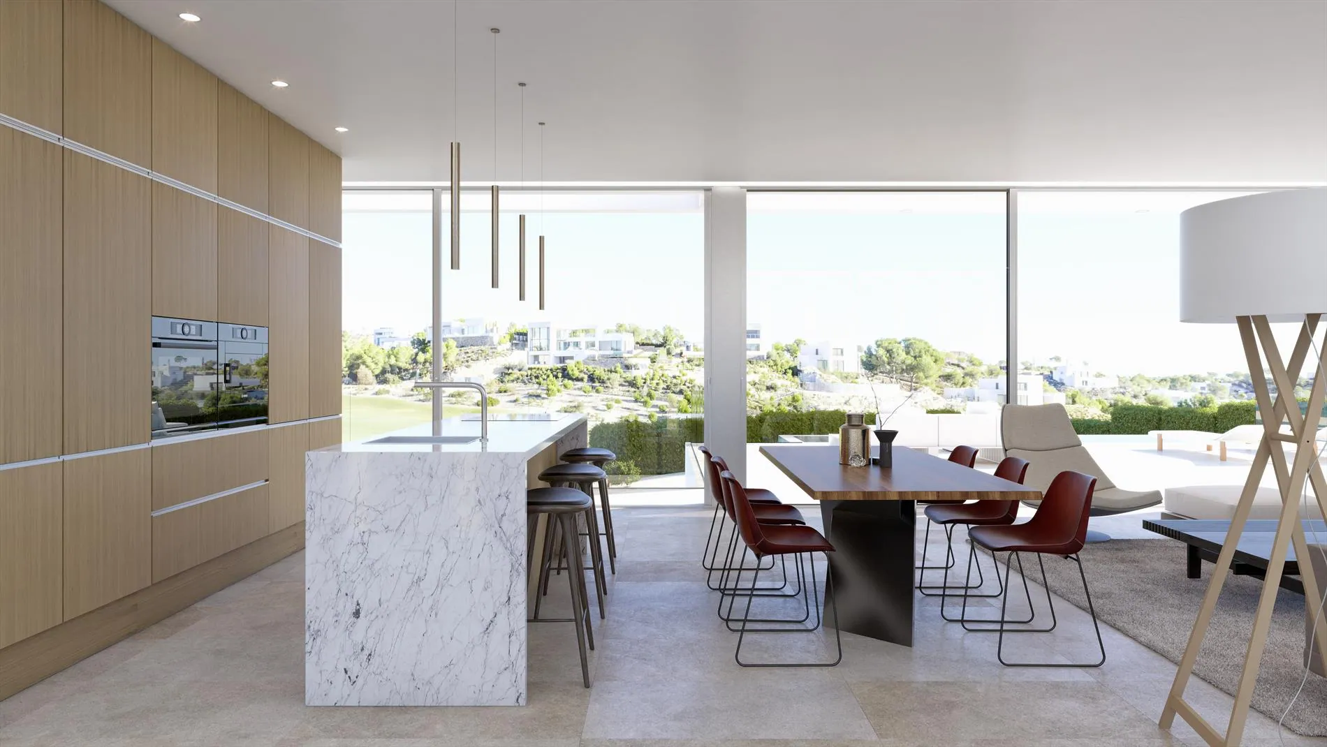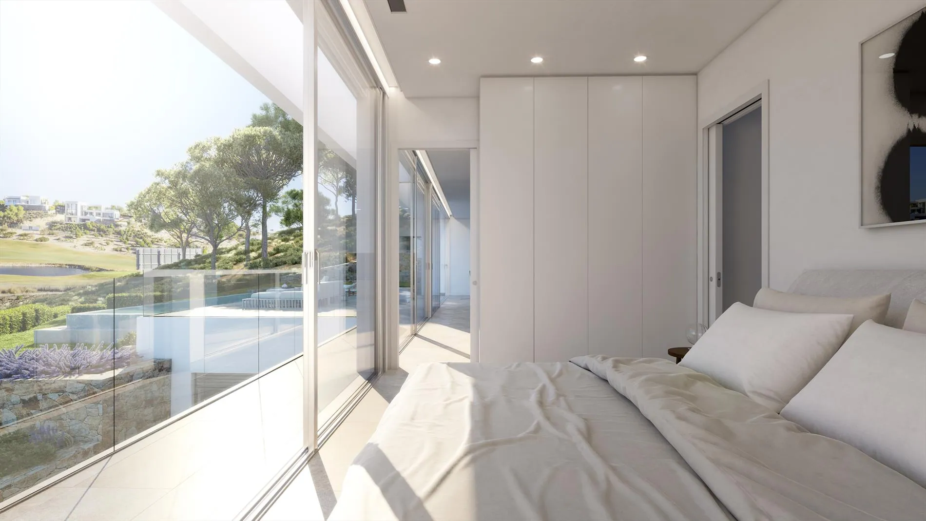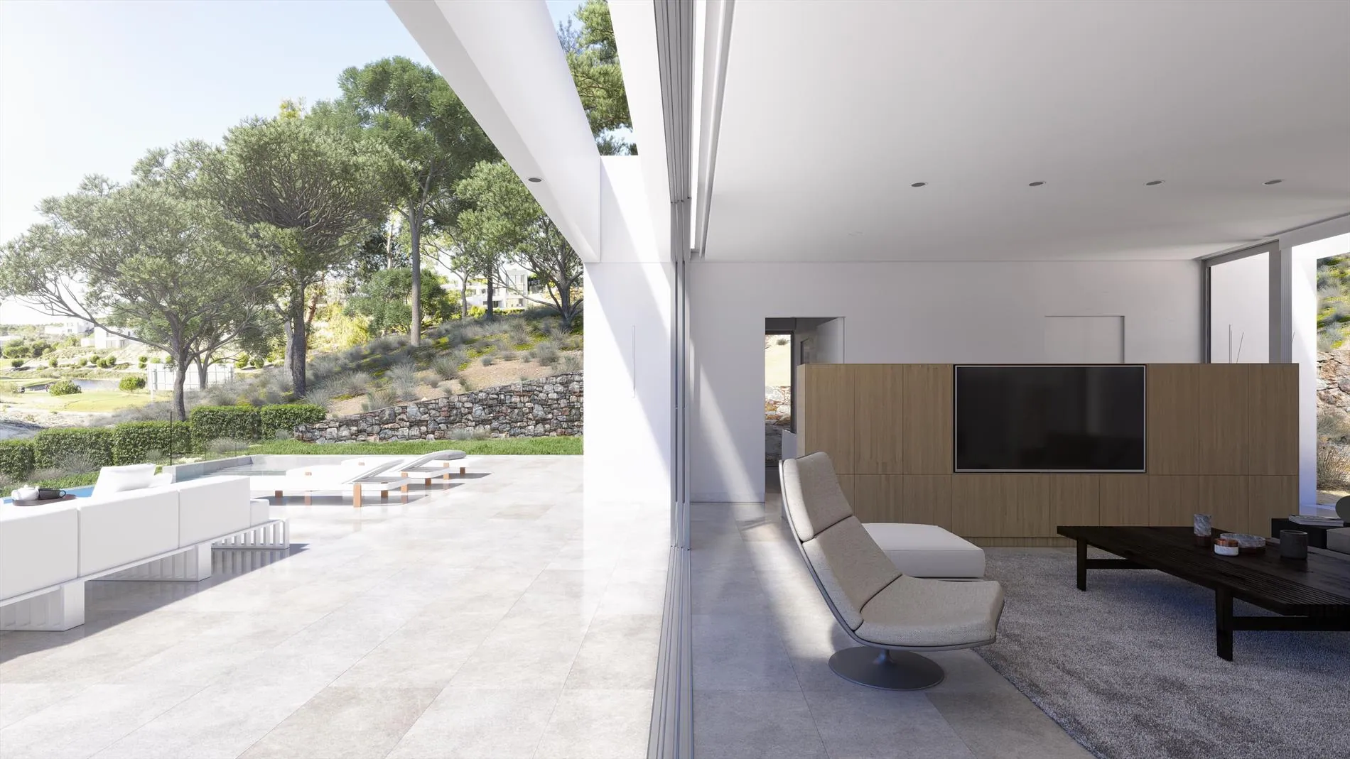 Het ruime terras zuigt je als het ware naar buiten waar je kunt genieten van de prachtige infinity pool enerzijds en het prachtige zicht op de golfcourse anderzijds.