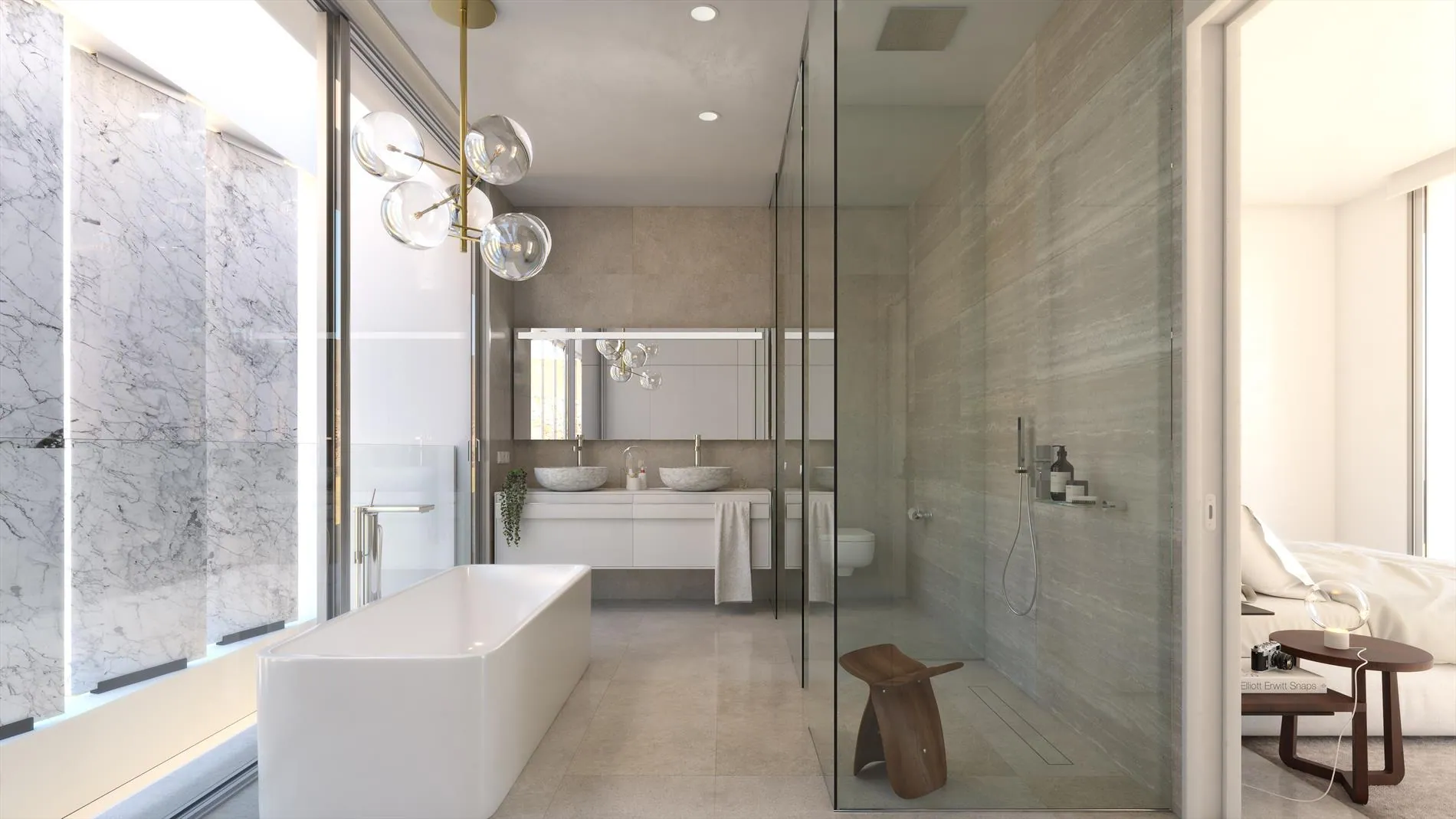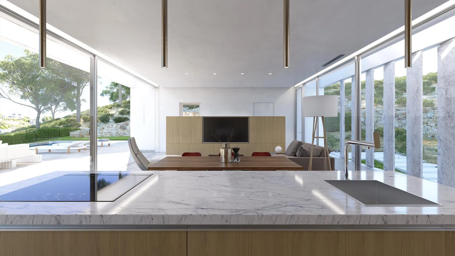 De facade van de villa is uniek met zijn marmeren slats waardoor er een speels spel van licht en schaduw wordt gecreëerd zowel binnen als buiten de villa.