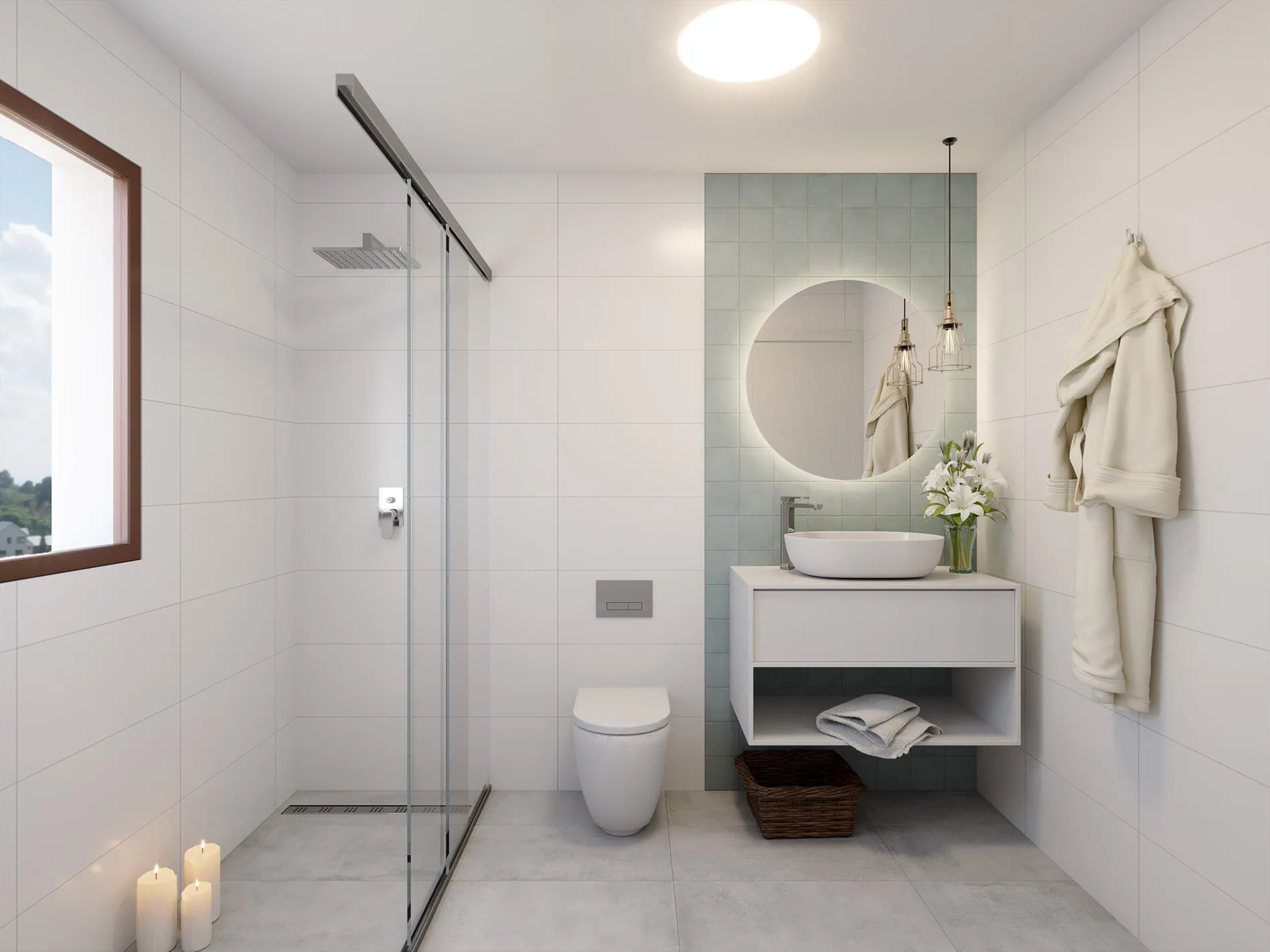 De natuurlijke texturen, zuivere en neutrale kleuren worden gecombineerd met de beste kenmerken op het gebied van kranen, toiletten, voorzieningen en indeling.
