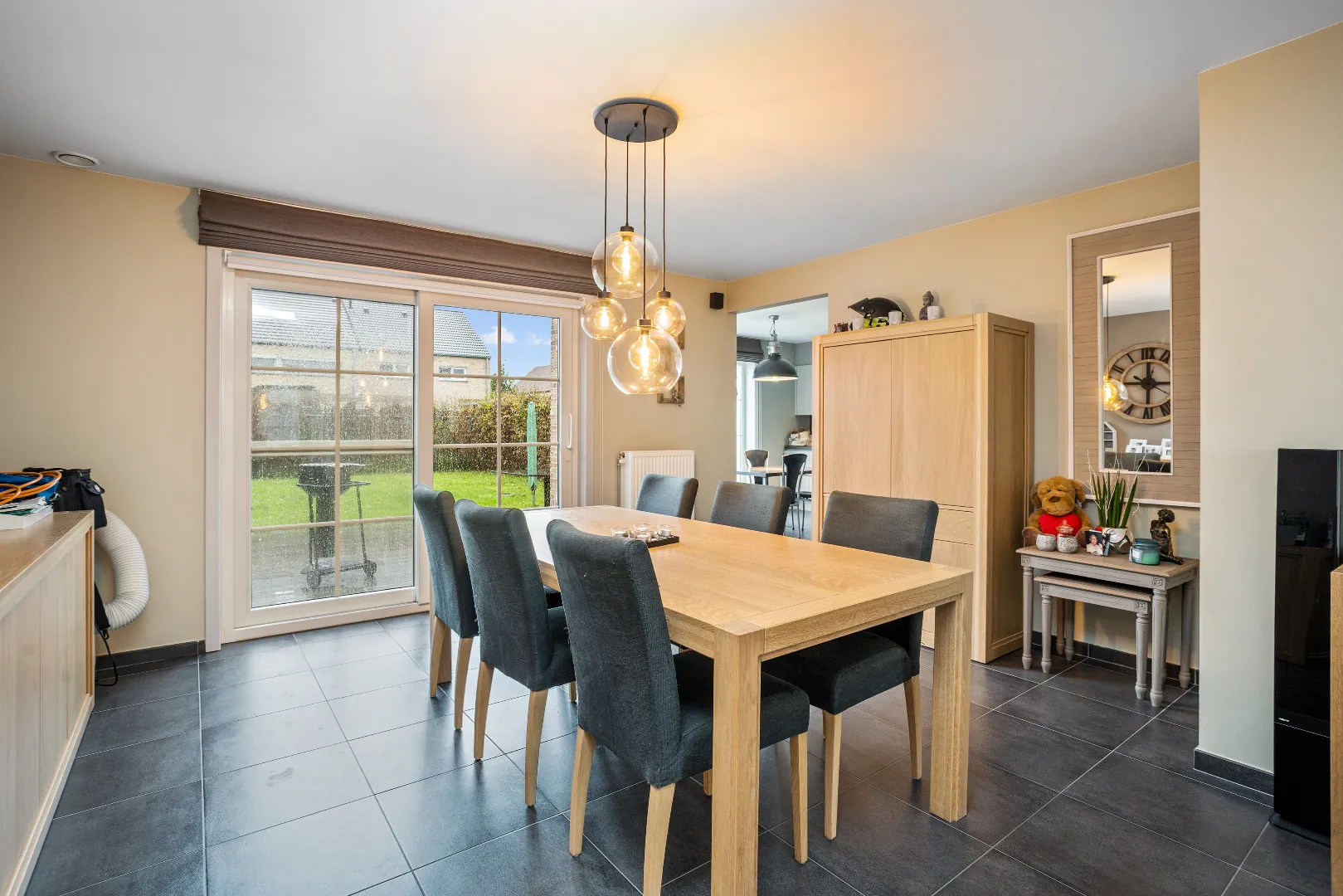Gelijkvloers: Inkomhal met gastentoilet - ruime lichtrijke leefruimte met zit- en eetplaats - volledig ingerichte keuken - wasplaats - garage met automatische sectionaalpoort.