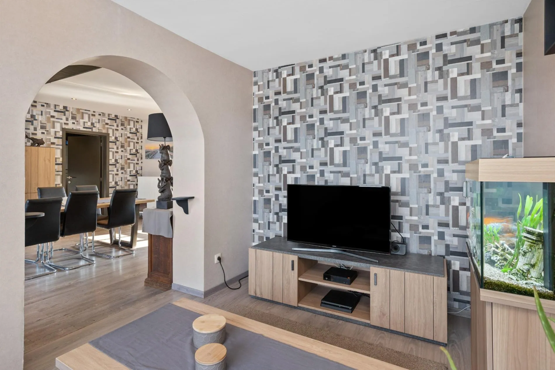 Gelijkvloers: inkom - woon- en eetkamer met zithoek - open volledig ingerichte keuken - badkamer met ligbad, inloopdouche en toilet - wasplaats.