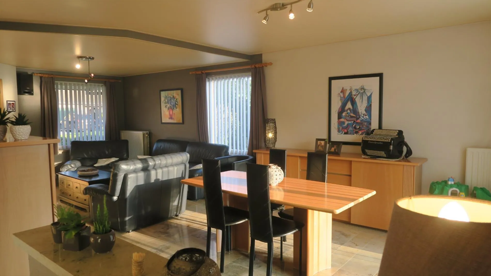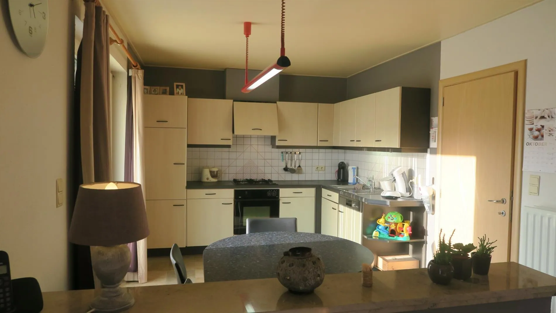 Gelijkvloers: inkomhal met apart toilet - lichtrijke leefruimte - aansluitende open, ingerichte keuken - ruime garage.