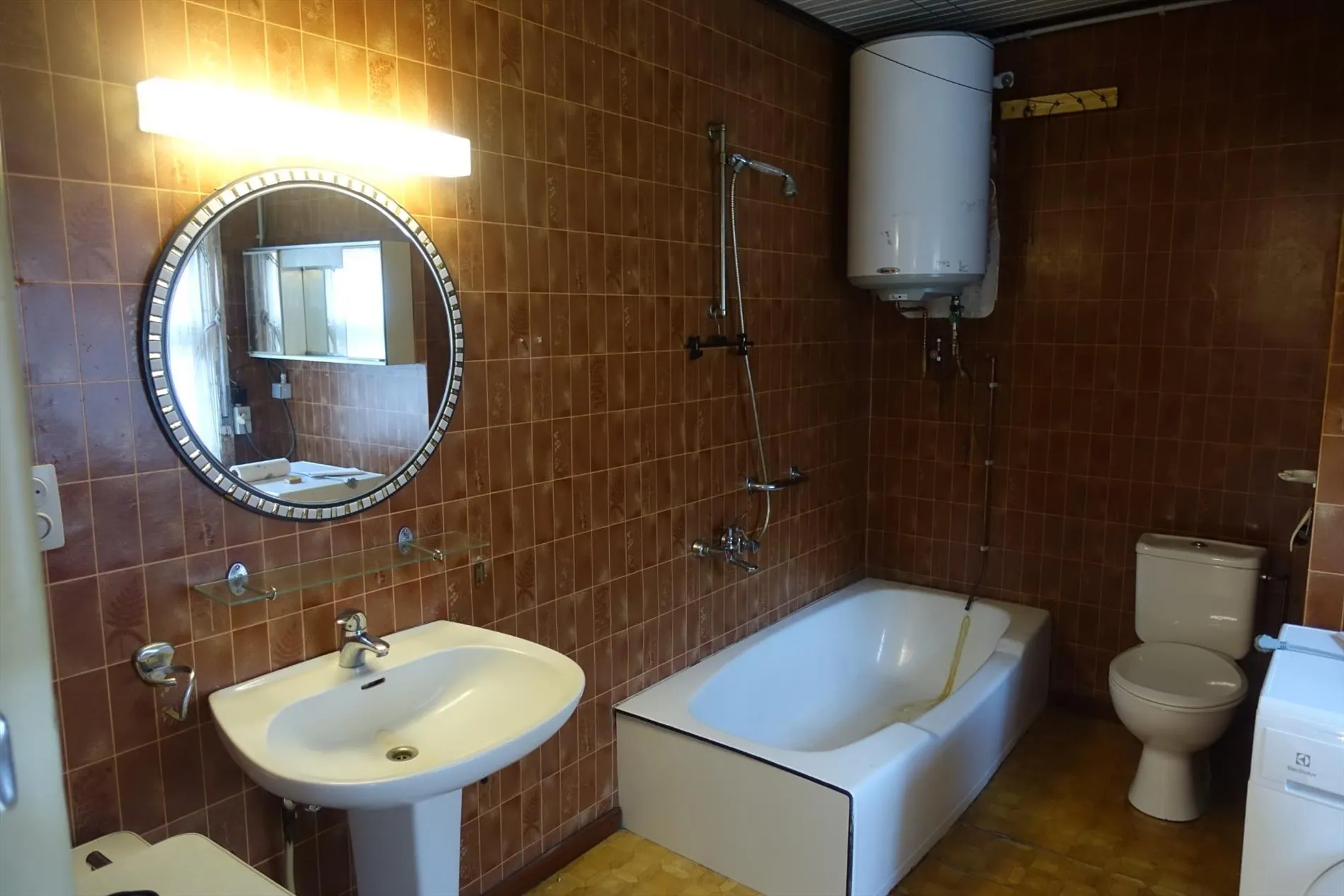 Gelijkvloers: Inkomhal met vaste trap richting verdieping - ruime leefruimte met veel lichtinval - leefkeuken - badkamer met bad met douchecomfort, wastafel en toilet - splende/berging - vrijstaande garage