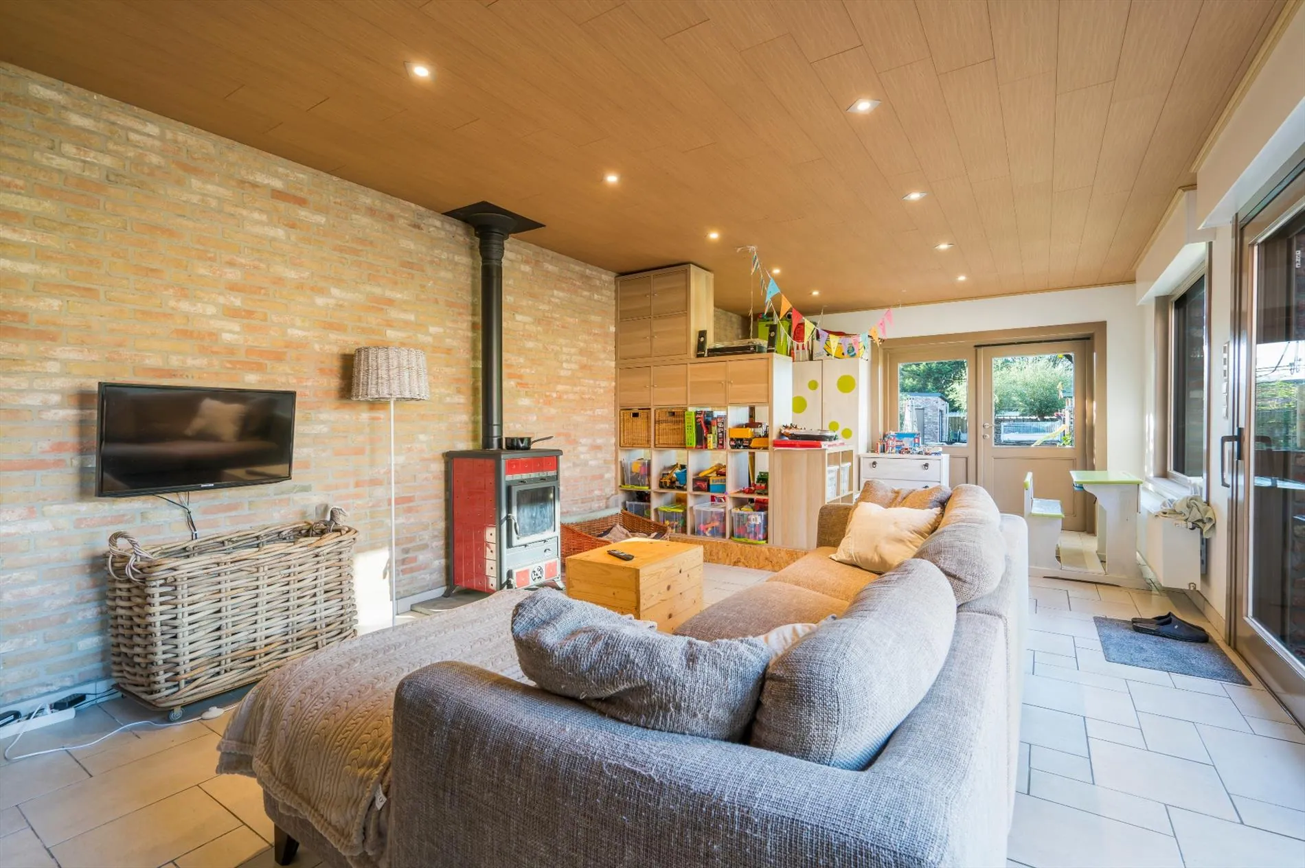 Gelijkvloers: Inkomhal - ruime leefruimte met gascassette - open ingerichte keuken - gezellige leefruimte in de uitbouw met houtkachel - badkamer met douche, toilet en wastafel.