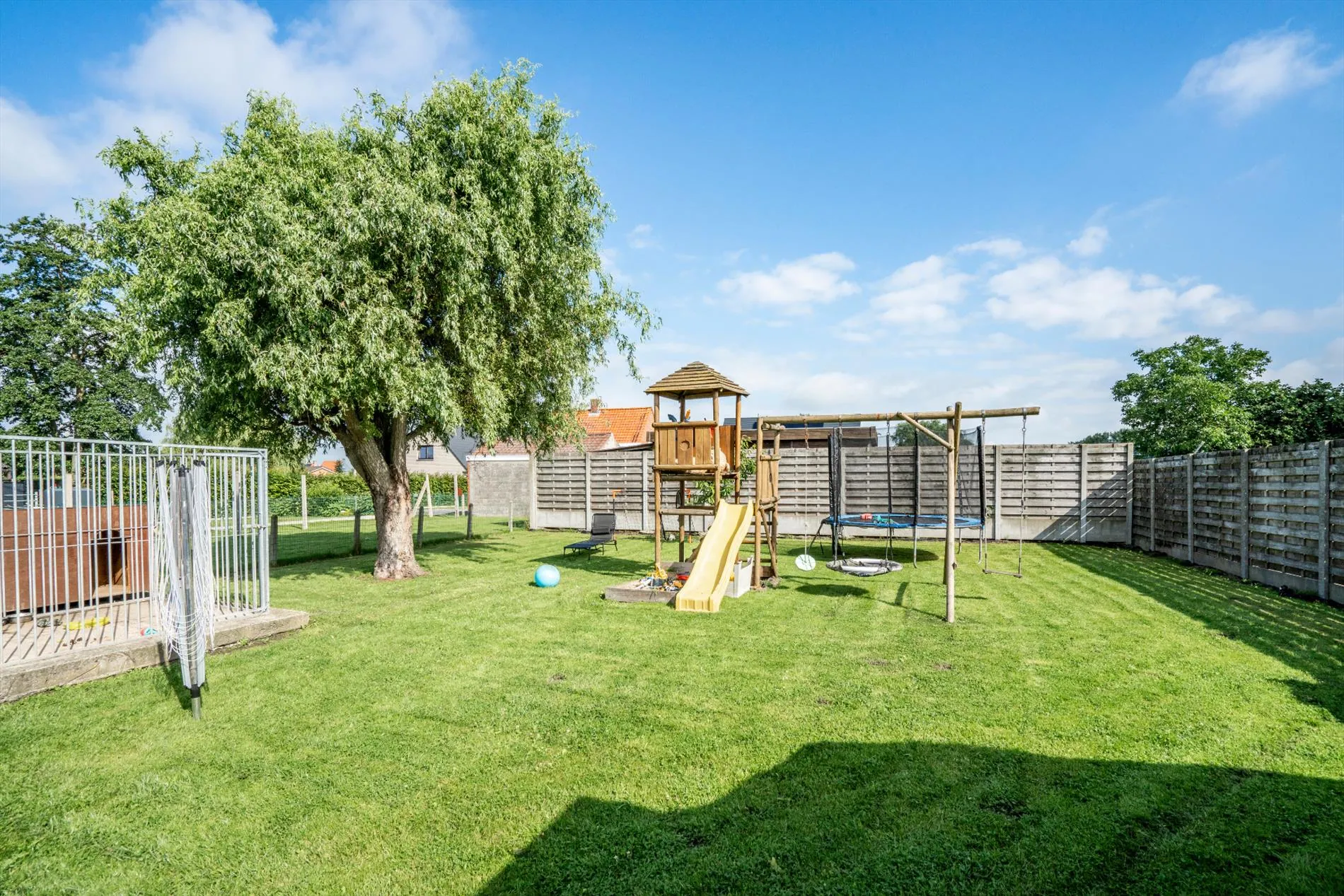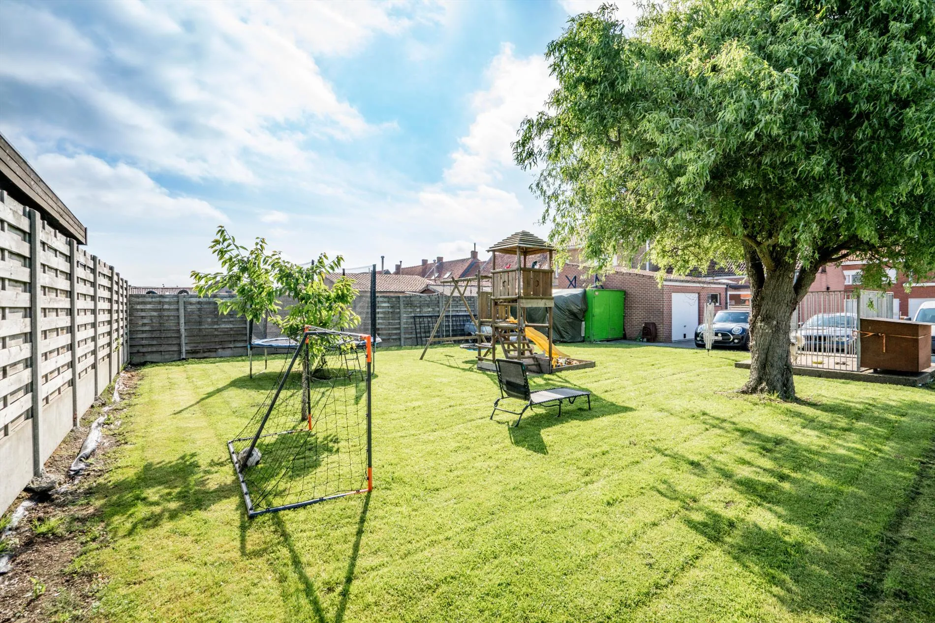 Ruime kindvriendelijke tuin met grote oprit.