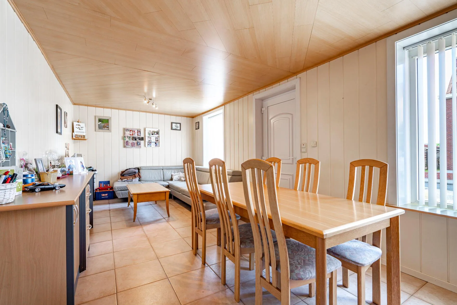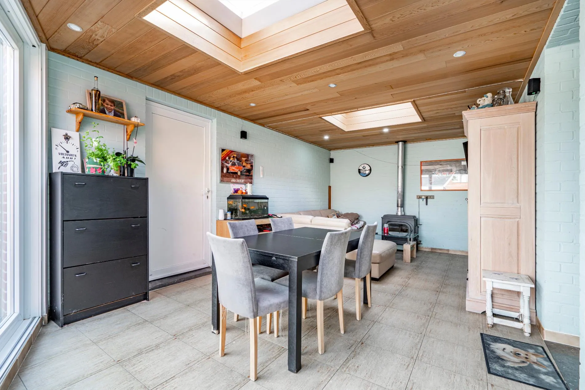 Gelijkvloers: lichtrijke leefruimte met pelletkachel - ingerichte keuken - gang - ruime leefveranda met houtkapbedrijven - badkamer - ruime garage