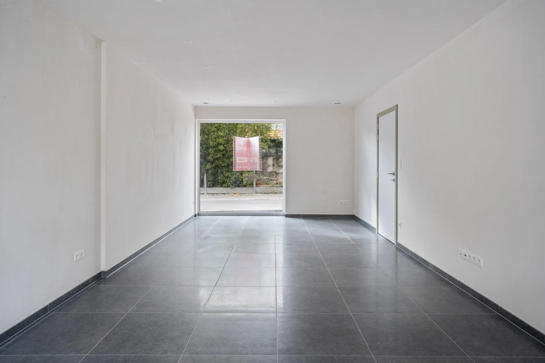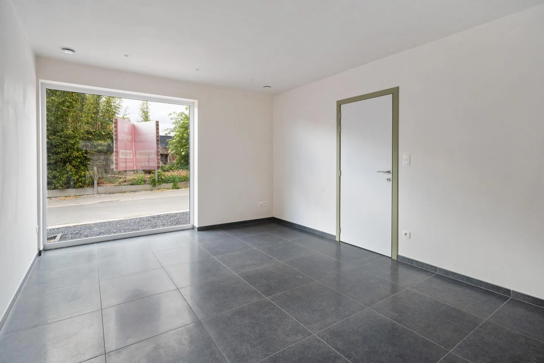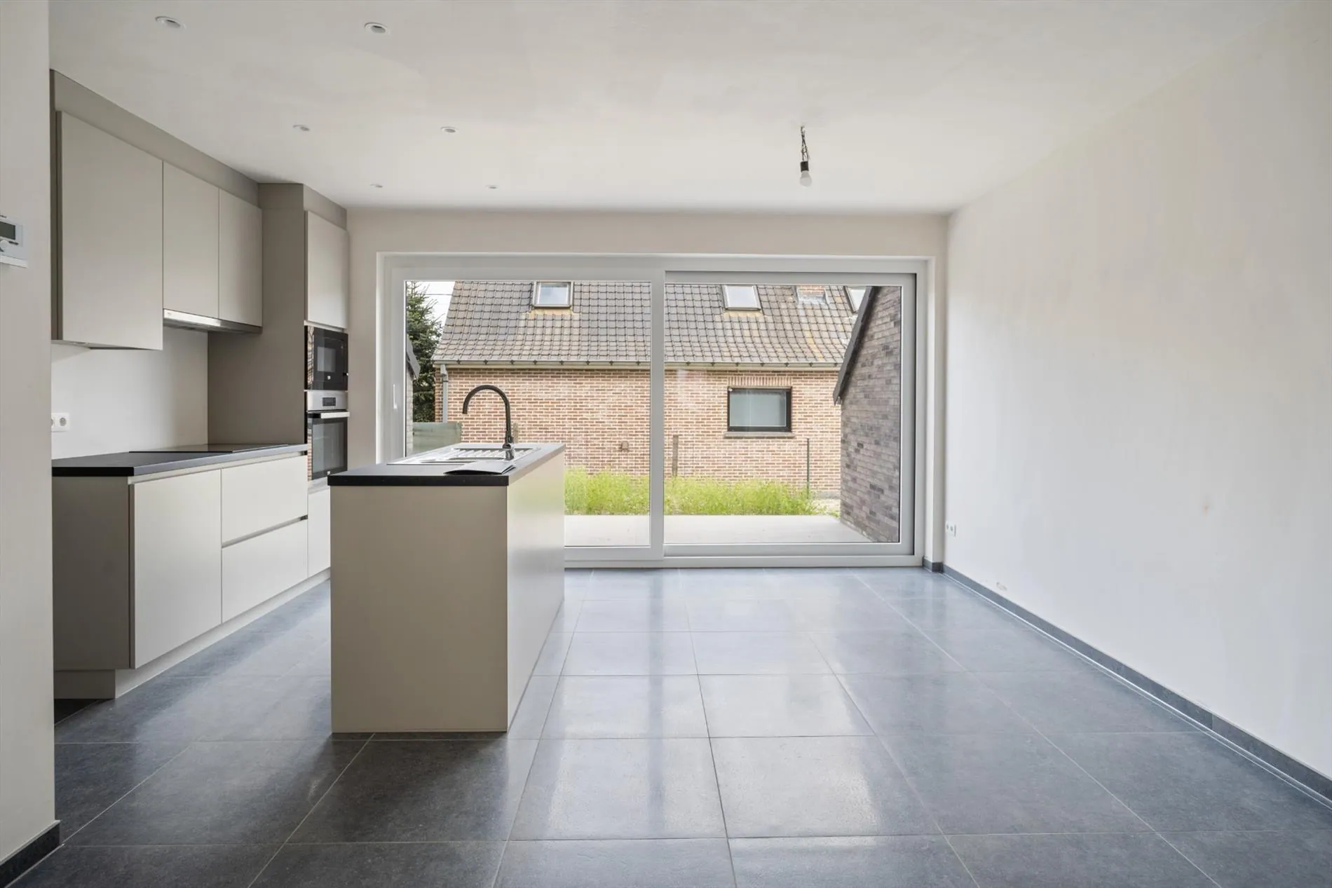 Gelijkvloers: inkomhal met apart gastentoilet - ruime leefruimte met open (volledig ingerichte) keuken concept - garage met aparte bergruimte - tuin met terras.