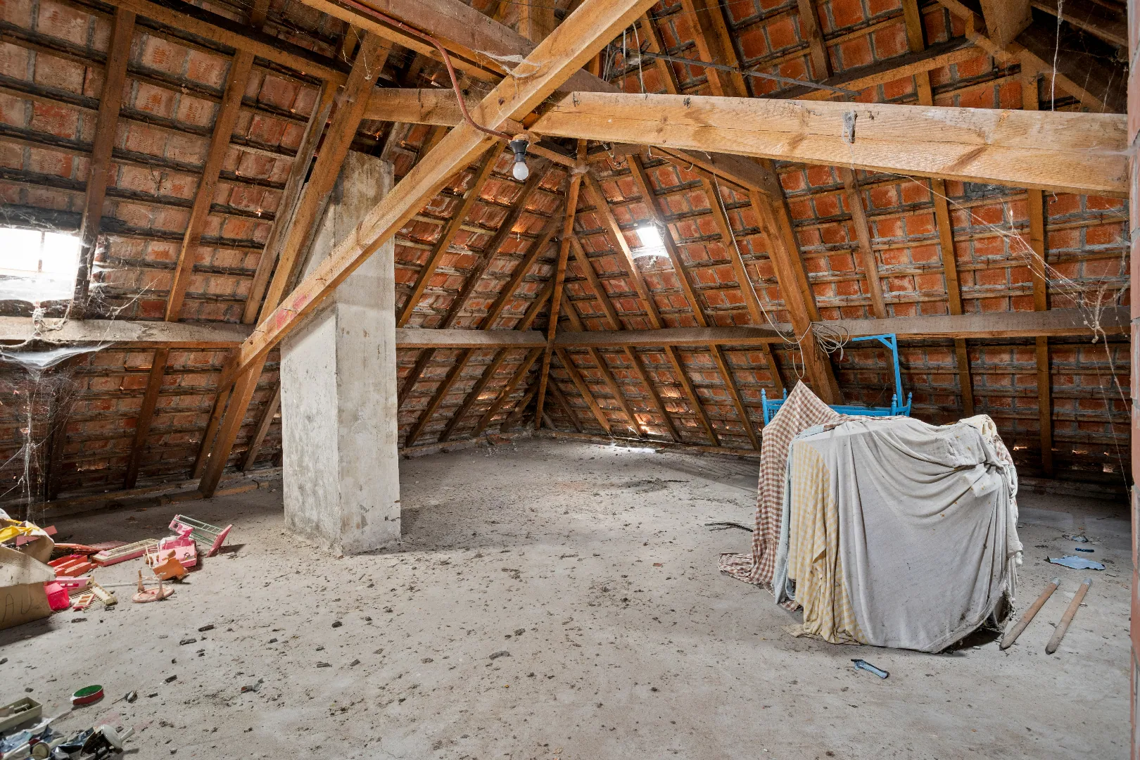 Tweede verdieping: ruime zolder die zich uitstrekt over de volledige woning en toegankelijk is via een vaste trap