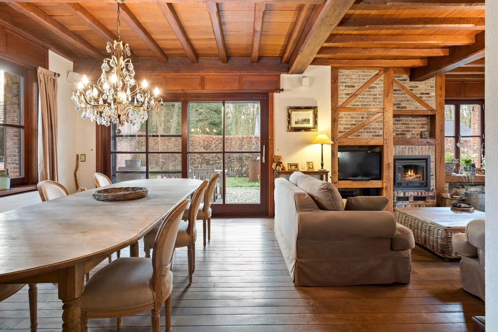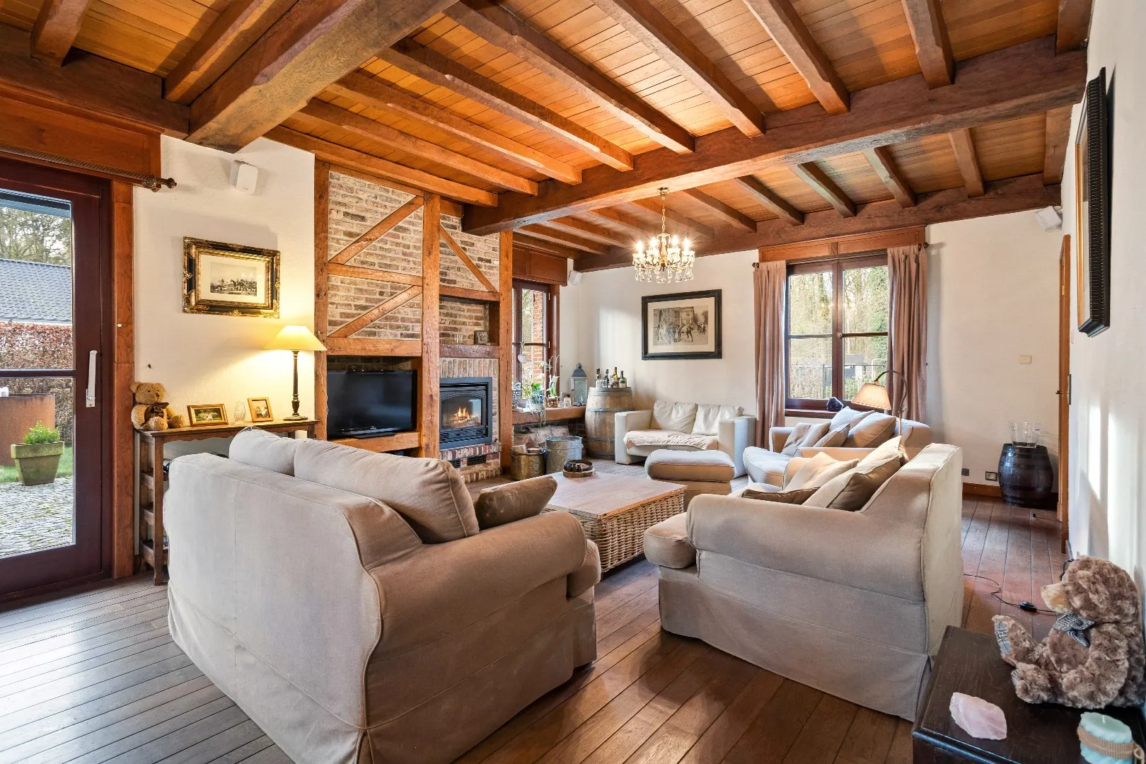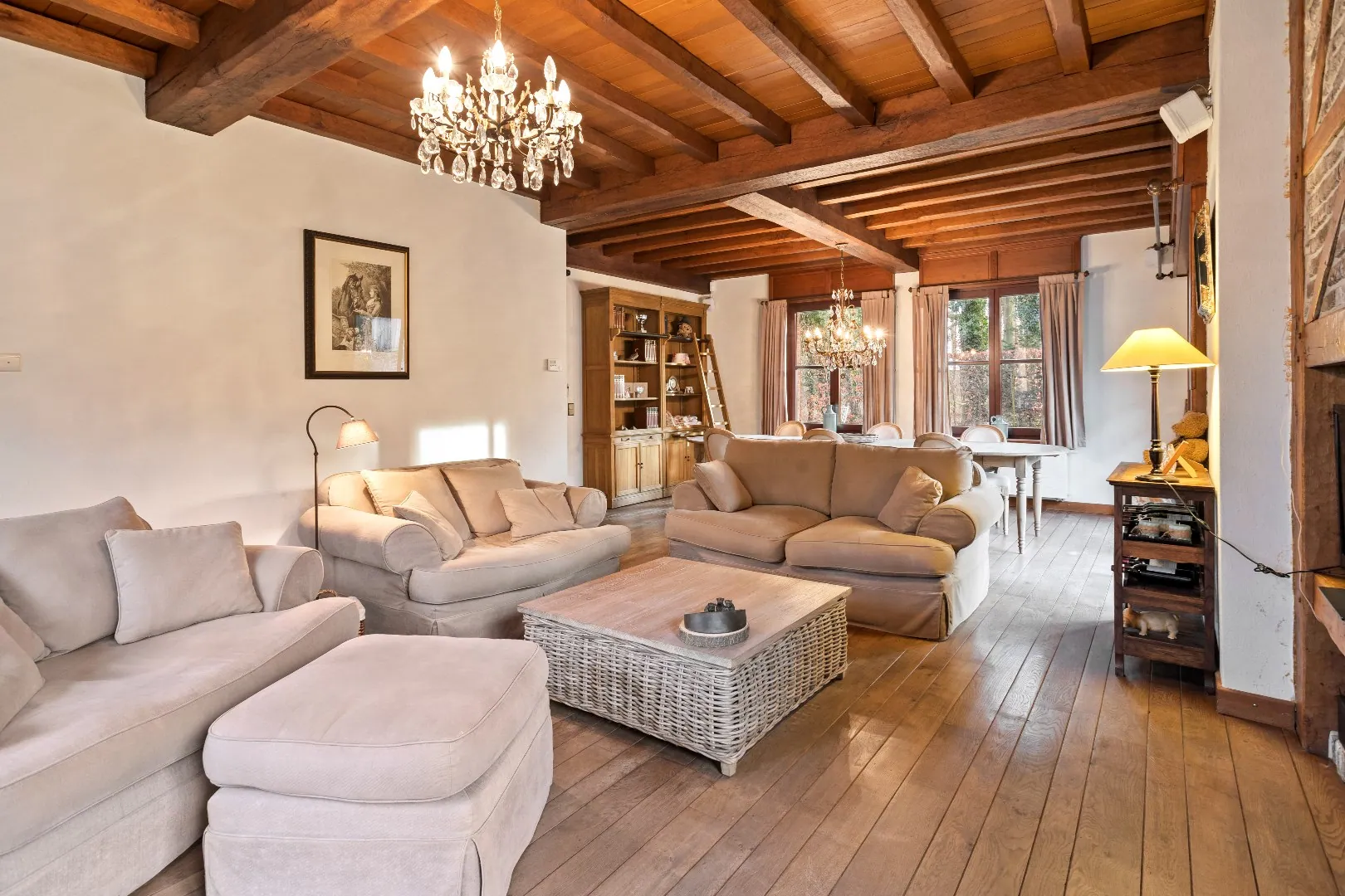 Gelijkvloers: Riante inkomhal - gastentoilet - ontvangstruimte/bureau - Zongerichte, rustieke leefruimte - ingerichte keuken - bijkeuken - berging - nachthal - 2 ruime slaapkamers - badkamer - apart toilet - dubbele garage